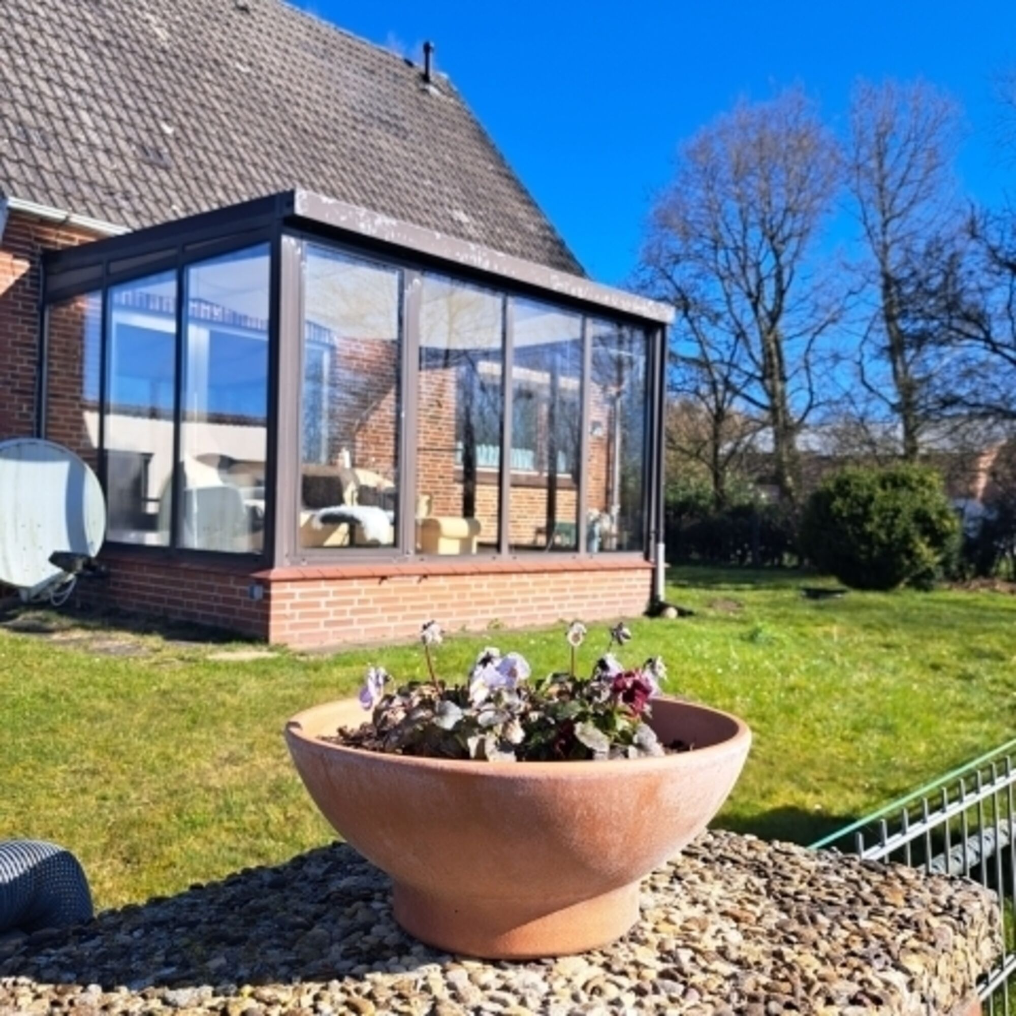 Das Haus verfügt über einen großen, hundefreundlichen Garten, einen hellen Wintergarten und eine überdachte Terrasse mit Blick in die freie Natur. Direkt hinter dem Haus erstreckt sich eine weite Wiese, auf der Sie mit etwas Glück Rehe beobachten können. Auch Gänse und Kraniche fliegen regelmäßig vorbei – ein echtes Highlight für Naturfreunde!