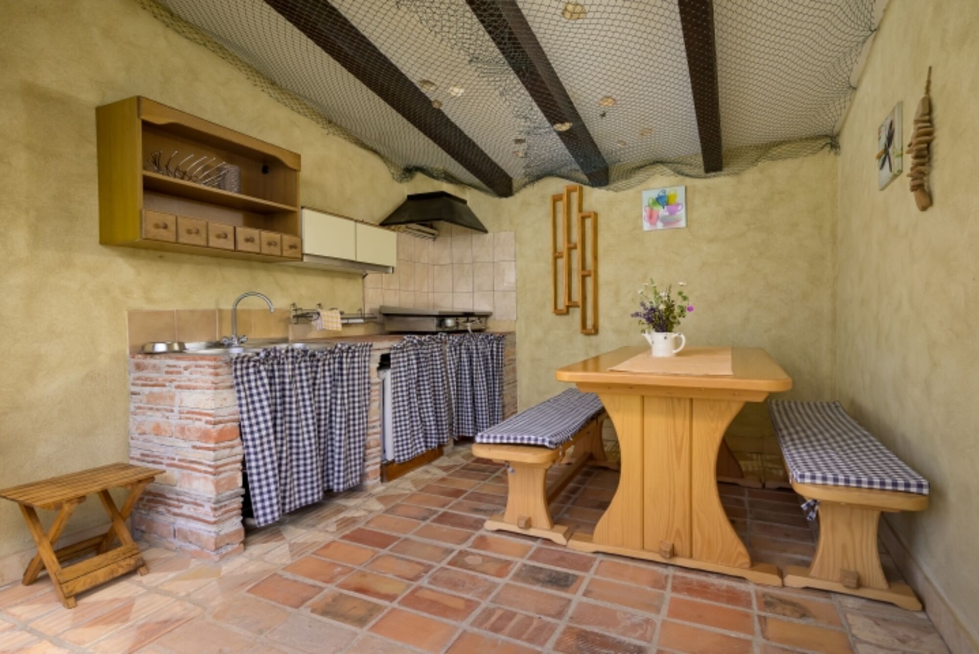 Es verfügt über drei großzügige Schlafzimmer, eine voll ausgestattete Küche, ein gemütliches Wohnzimmer sowie einen gepflegten Außenbereich. Der private Pool mit Sonnenliegen lädt zum Entspannen ein, während die überdachte Terrasse ein perfekter Ort für gesellige Abende oder Mahlzeiten im Freien ist.