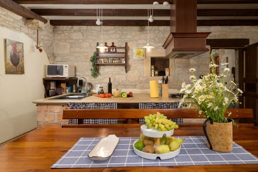 Das Haus Božac im Herzen Istriens bietet drei Schlafzimmer, eine Küche, ein Wohnzimmer, einen privaten Pool, eine Sonnenterrasse und eine überdachte Veranda. Umgeben von Grün ist es ideal für Familien, Freunde und Haustiere – perfekt zum Entspannen in authentischer istrischer Atmosphäre.