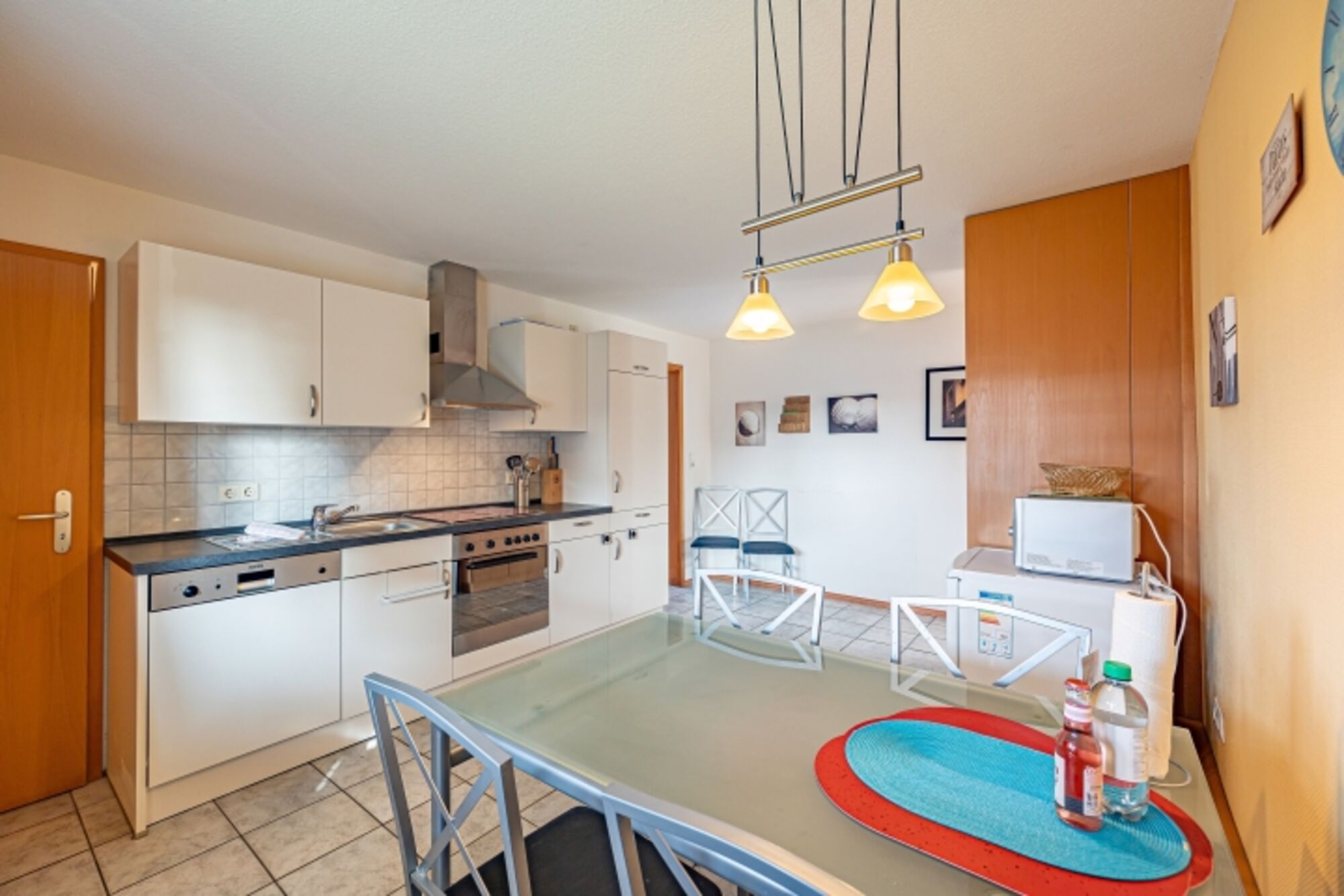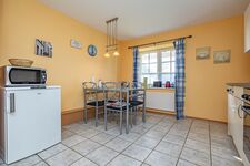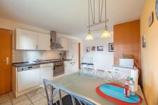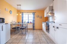 In der Küche steht alles bereit, was Sie für einen Selbstversorgerurlaub brauchen: ein großer Kühl- und Gefrierschrank, ein Herd mit Cerankochfeld, ein Geschirrspüler, eine Kaffeemaschine sowie der Esstisch.