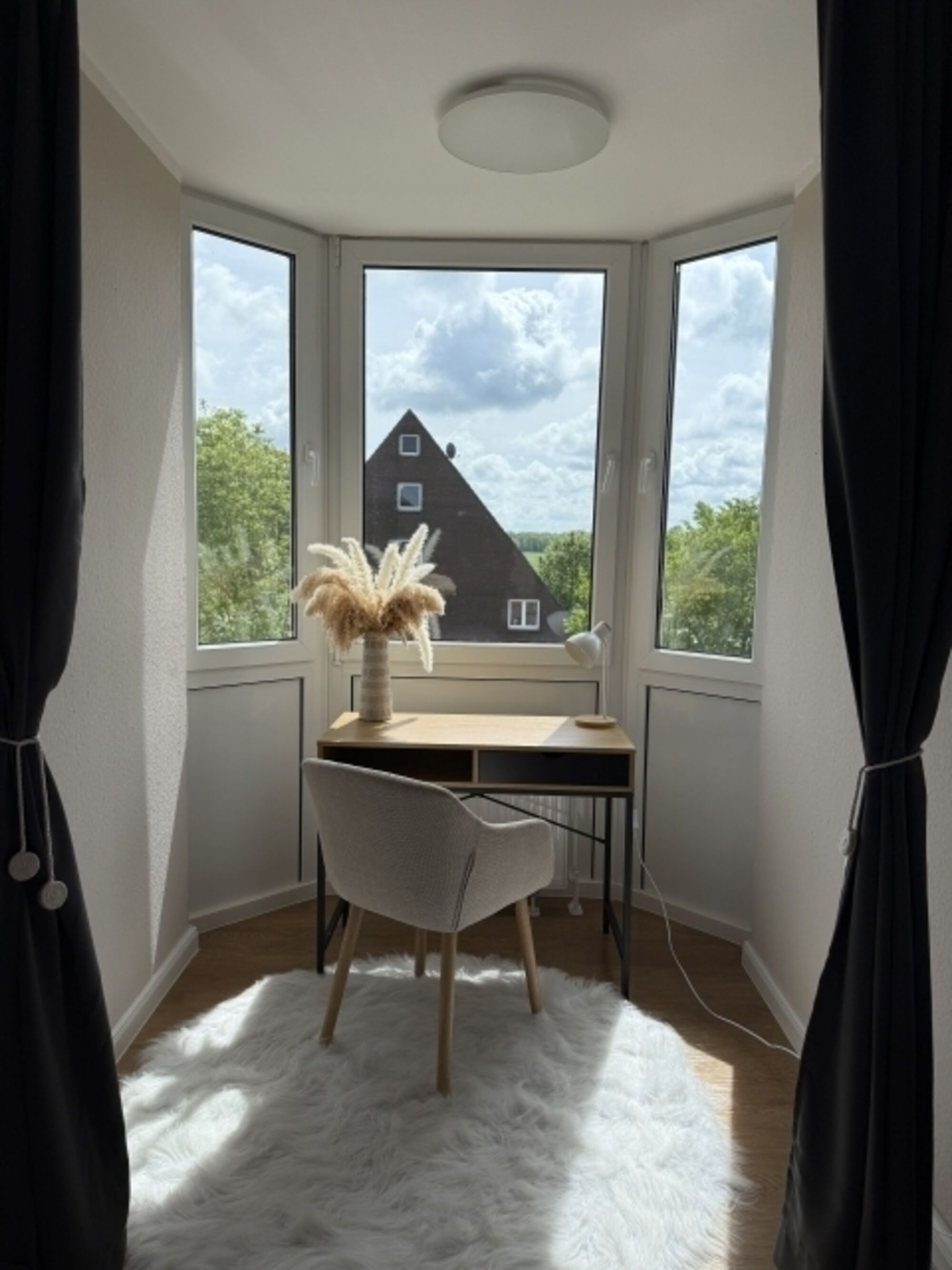 Besonders charmant: Zwei großzügige Erker im Schlafzimmer und im Esszimmer, die euch morgens mit Sonnenstrahlen wecken und abends mit weiten Blicken Richtung Sonnenuntergang verabschieden. Während ihr beim Frühstück im Erker sitzt oder bei einem Glas Wein den Tag Revue passieren lasst, macht es sich euer Vierbeiner gemütlich – oder beobachtet neugierig das Geschehen draußen.