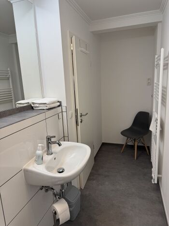 Das geschmackvoll eingerichtete Badezimmer verfügt über einen Fön, großzügige Dusche, ein Waschbecken und ein WC. Selbstverständlich halten wir auch Handtücher, Handseife und Toilettenpapier für Sie bereit. Waschbecken, Regendusche, Spiegel