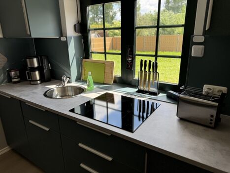 4-Platten Herd, Cerankochfeld, Induktionsherd, Dunstabzugshaube, Gefrierschrank, Mixer, Korkenzieher / Flaschenöffner, Gewürze (Salz, Pfeffer, Zucker), Geschirrhandtücher, Mülltüten, Essplatz in der Küche, TV in der Küche