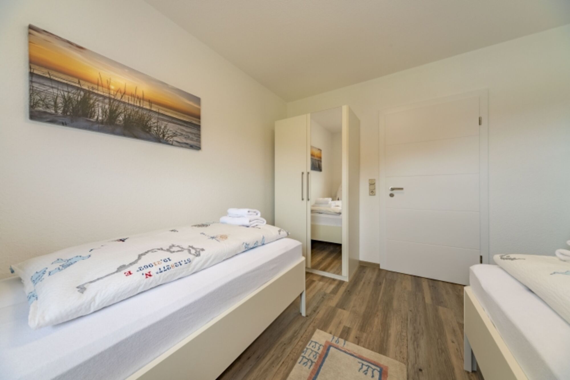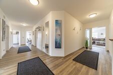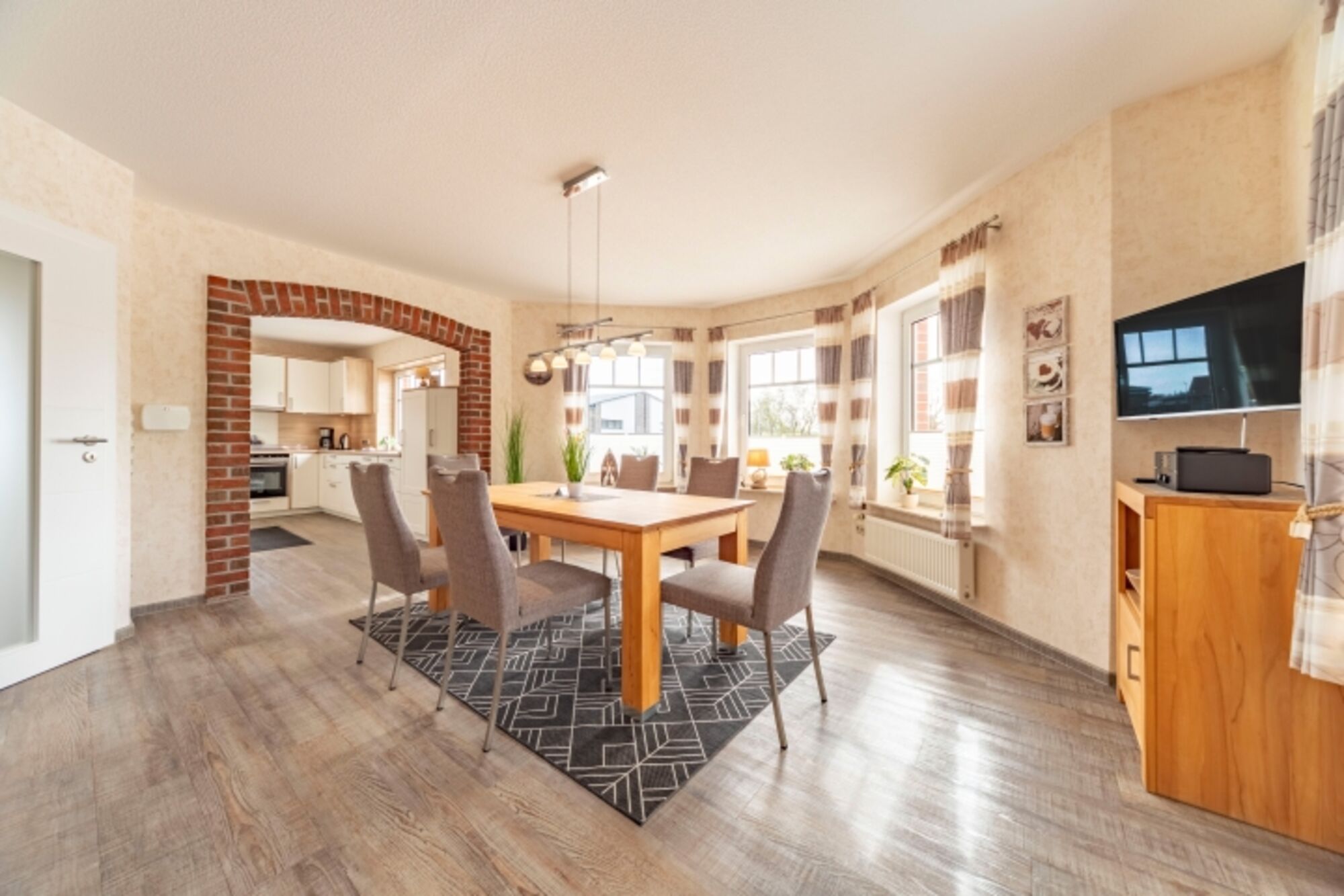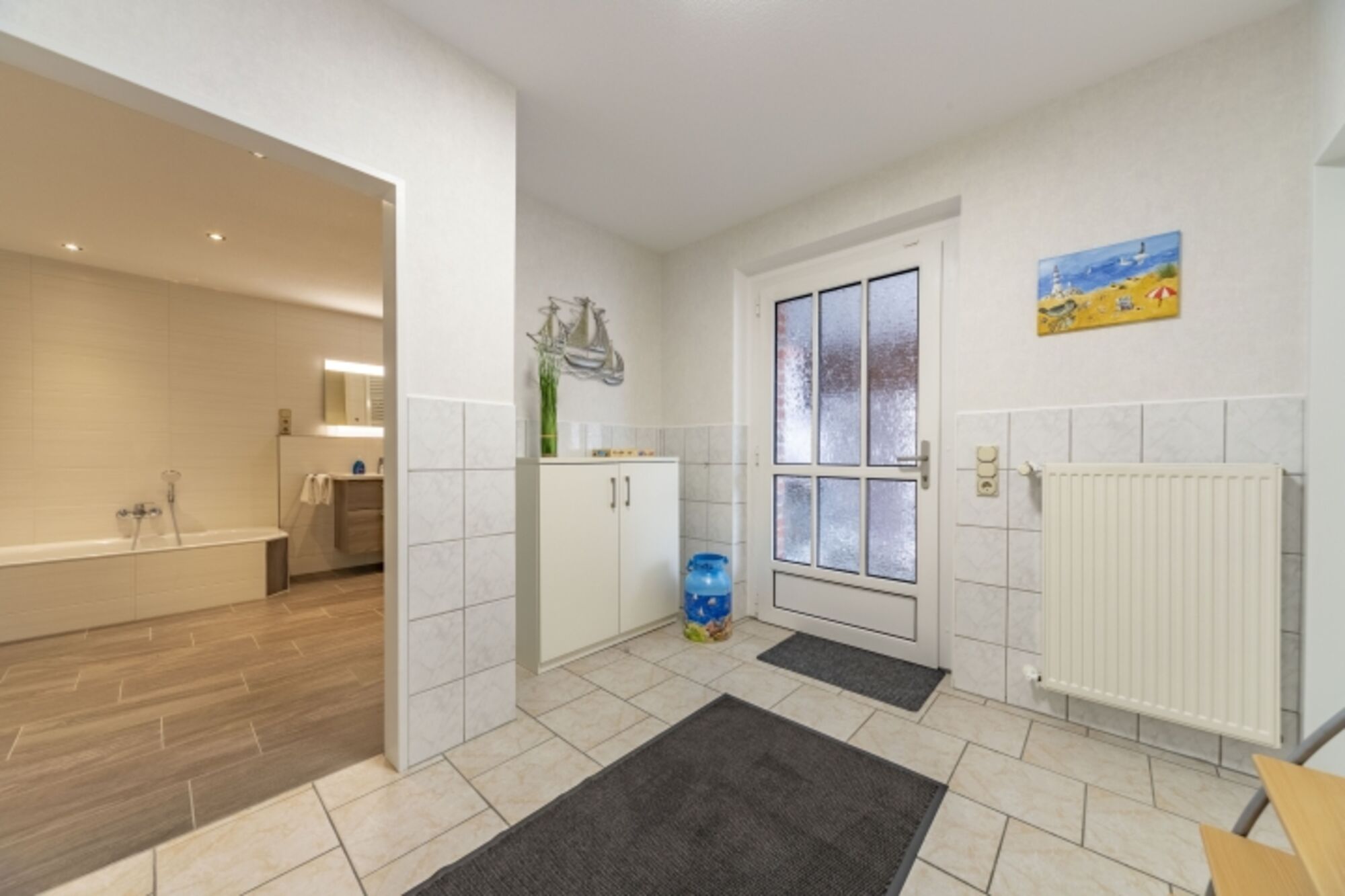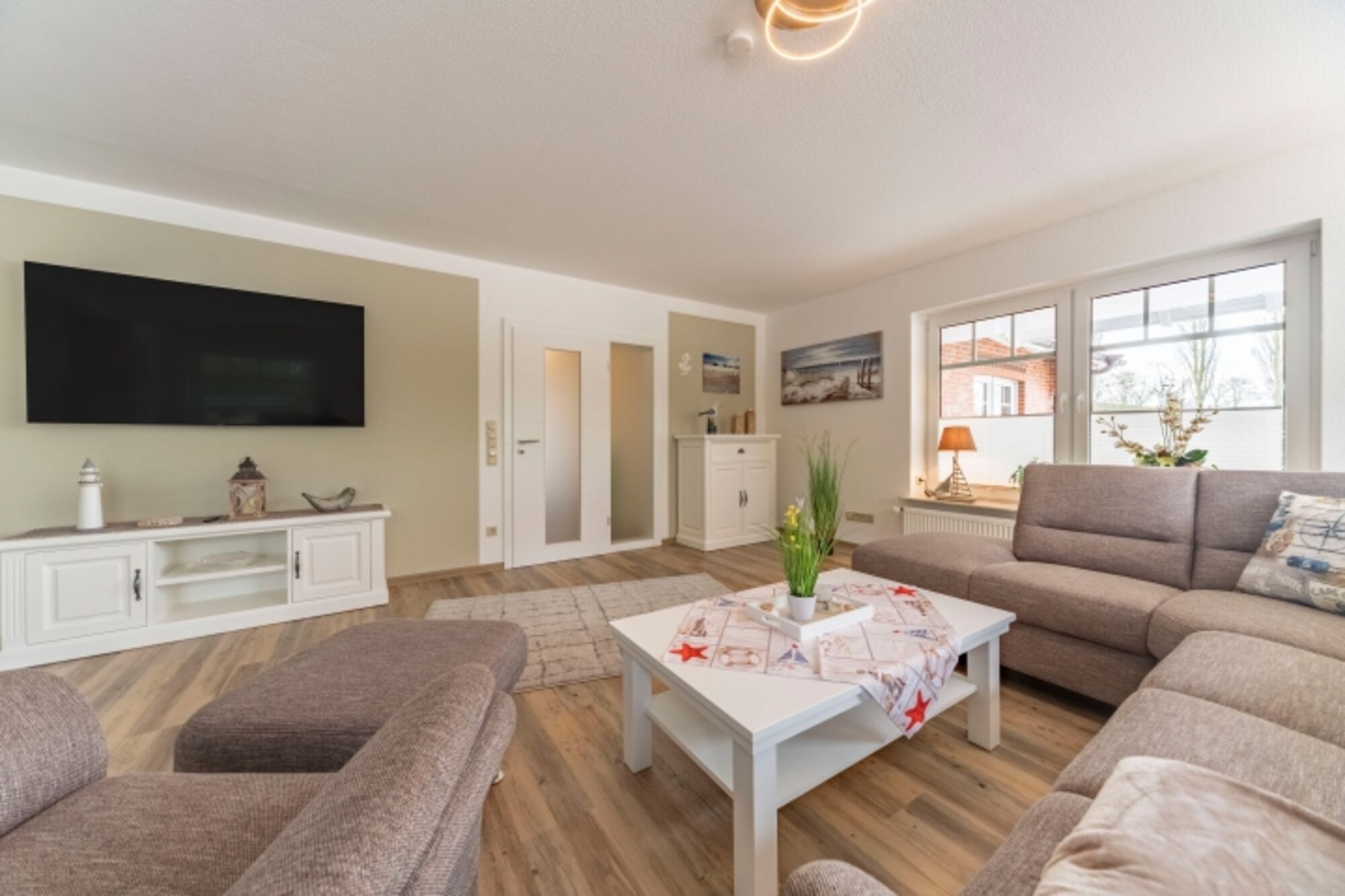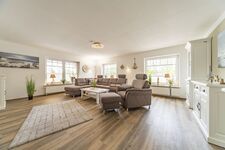 Die Wohnung "Friesenanker unten" verfügt über 2 separate Schlafzimmer, einer große - sowie komfortabel ausgestatteten - Küche (mit Induktionskochfeld) und einem offenen, angrenzenden Esszimmer. Von hier aus gelangt man auf die zum Teil überdachte Terrasse sowie Ihrem zugeordneten eigenen Garten. Das Wohnzimmer hat von einem großen QLED-Fernseher über die gemütliche Rundgarnitur einiges an Komfort zu bieten. Das große Badezimmer & WC ist sehr modern und mit bodenebener Dusche und Badewanne ausgestattet. Darüber hinaus steht noch ein getrenntes WC sowie eine große Diele zur Ihrer Verfügung.