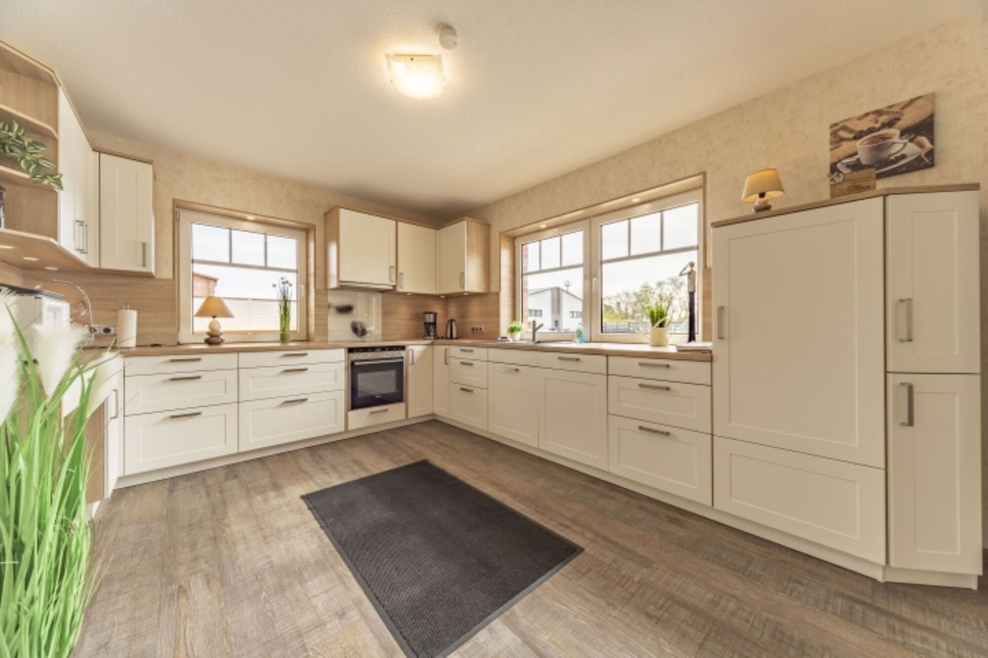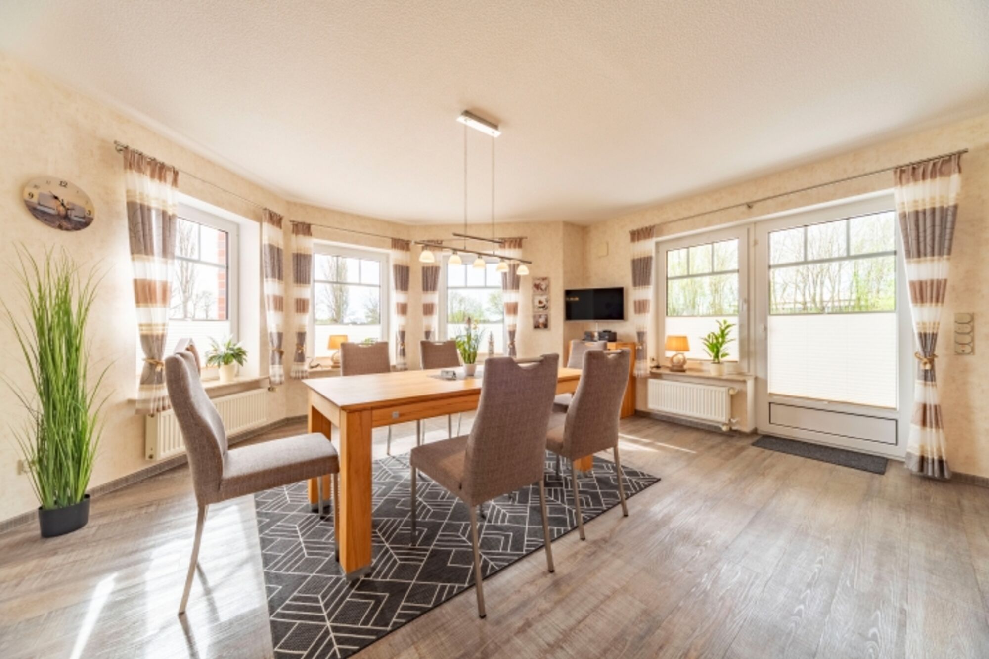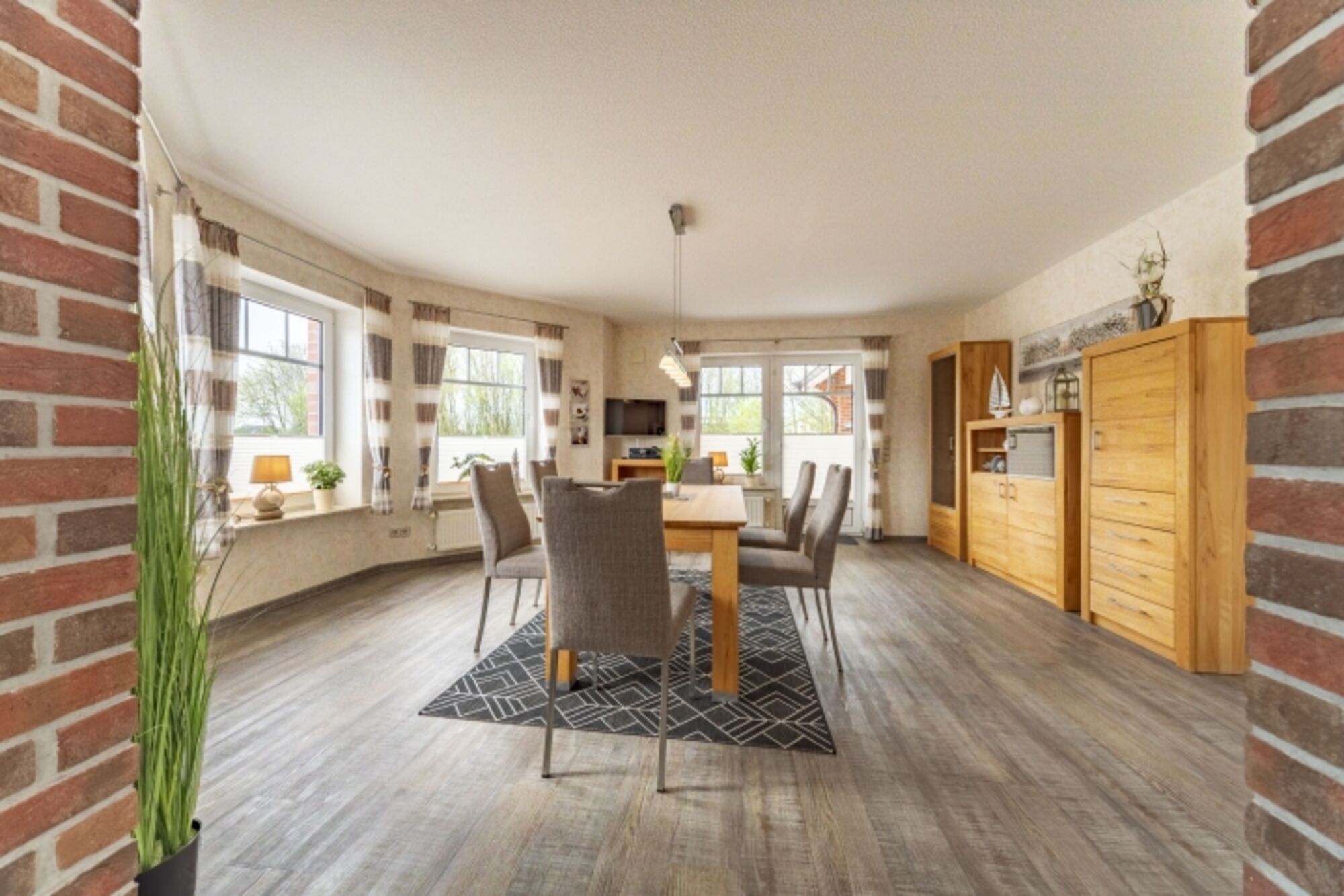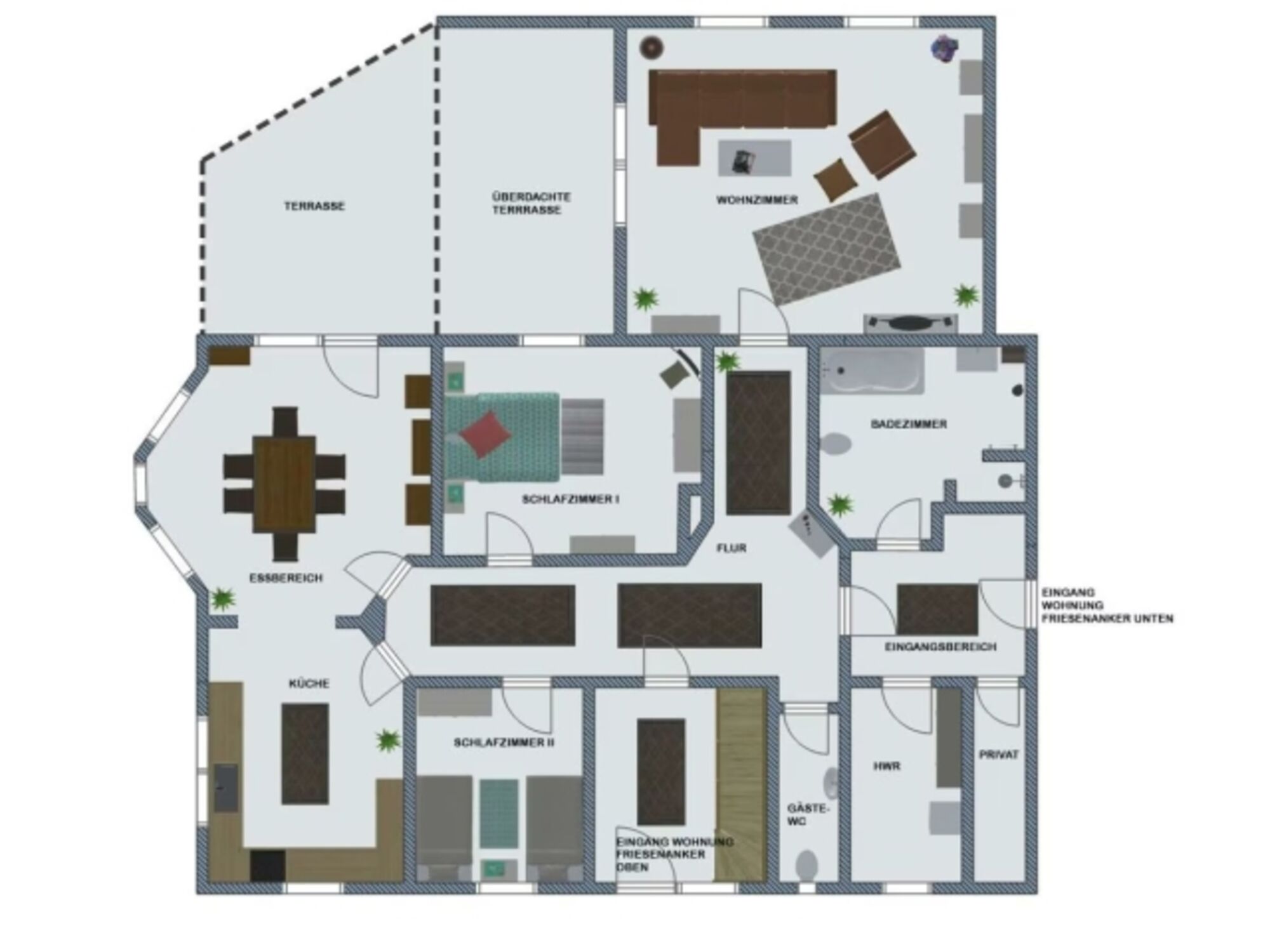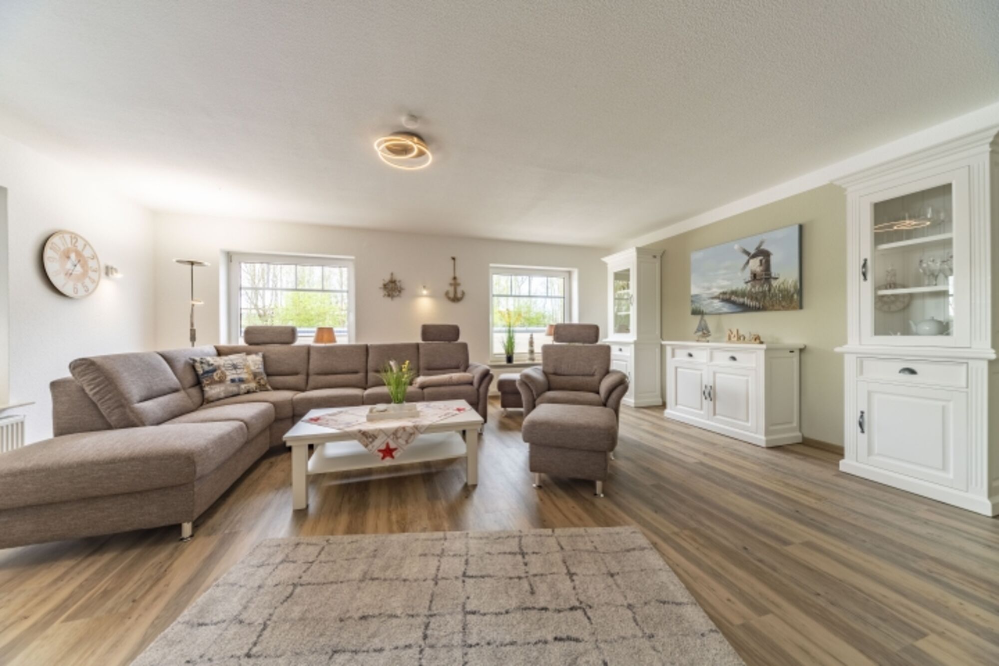 Die Wohnung "Friesenanker unten" verfügt über 2 separate Schlafzimmer, einer große - sowie komfortabel ausgestatteten - Küche (mit Induktionskochfeld) und einem offenen, angrenzenden Esszimmer. Von hier aus gelangt man auf die zum Teil überdachte Terrasse sowie Ihrem zugeordneten eigenen Garten. Das Wohnzimmer hat von einem großen QLED-Fernseher über die gemütliche Rundgarnitur einiges an Komfort zu bieten. Das große Badezimmer & WC ist sehr modern und mit bodenebener Dusche und Badewanne ausgestattet. Darüber hinaus steht noch ein getrenntes WC sowie eine große Diele zur Ihrer Verfügung.