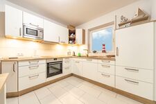 Cerankochfeld, Dunstabzugshaube, Kühlschrank mit Gefrierfach, Eierkocher, Mixer, Korkenzieher / Flaschenöffner, Geschirrhandtücher, Essplatz in der Küche