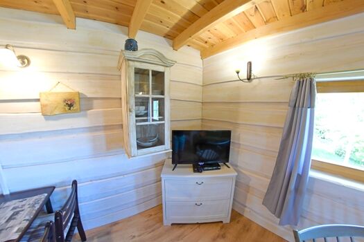 * Wohnraum mit Essecke, bequeme Sofa und Fernseher
