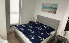 Das Elternschlafzimmer ist mit einem sehr bequemen Boxspringbett der Größe 180 x 200 cm mit getrennten Matratzen sowie einem geräumigen Schrank und einem Stuhl ausgestattet.