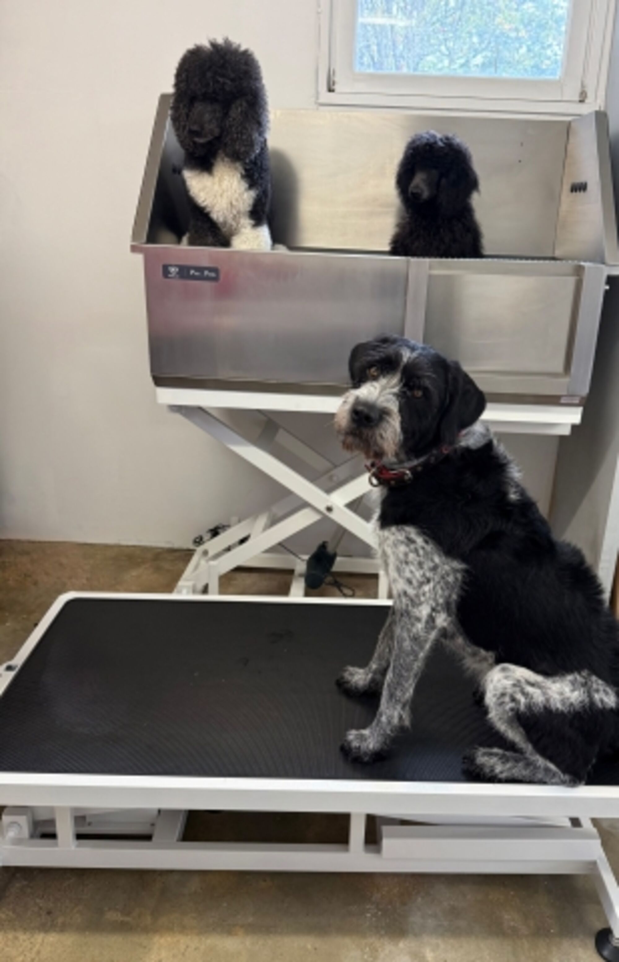 In der Garage befinden sich ein elektrisch höhenverstellbarer Schertisch und eine elektrisch höhenverstellbare Edelstahl-Hundebadewanne in Salon-Qualität.