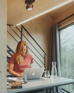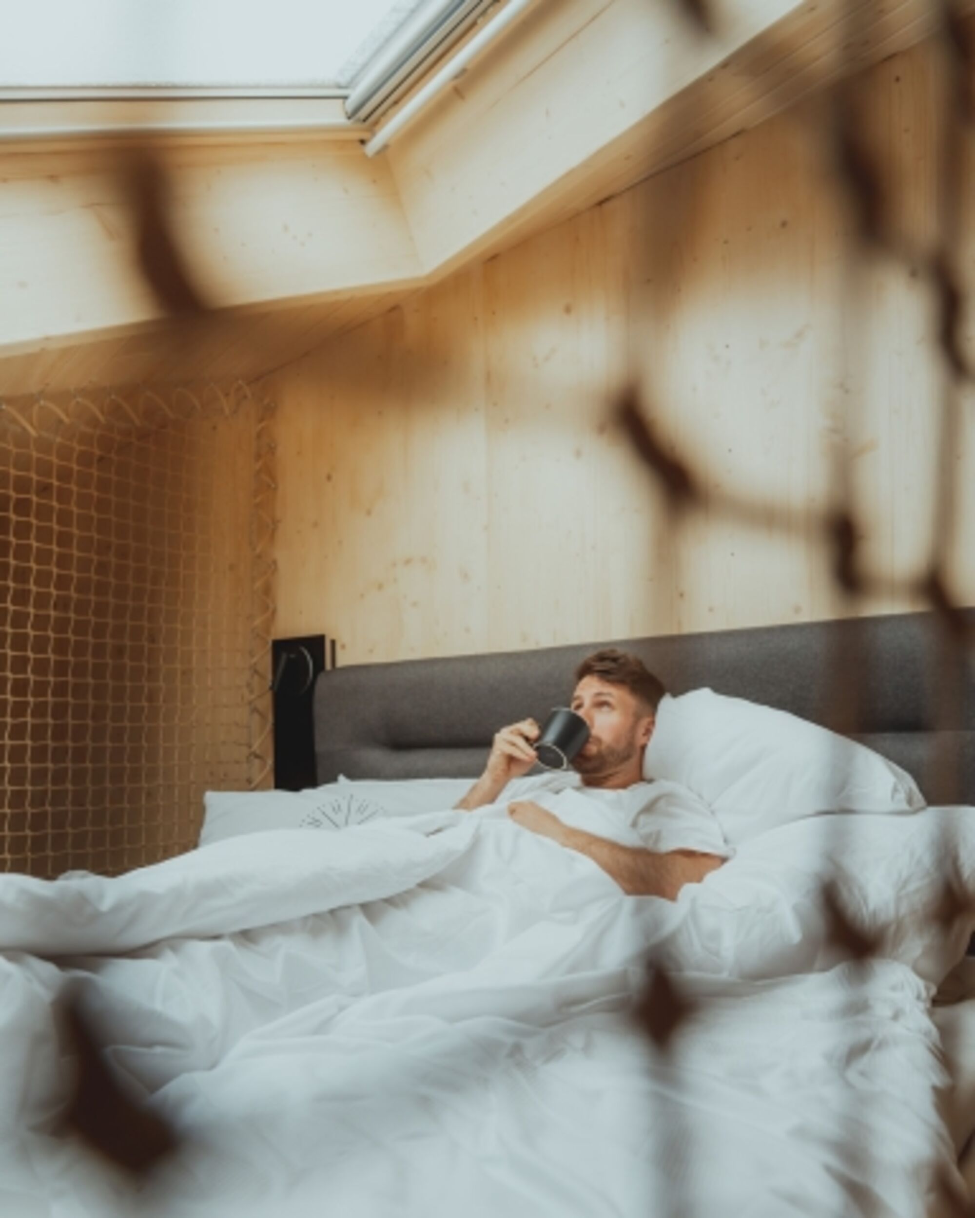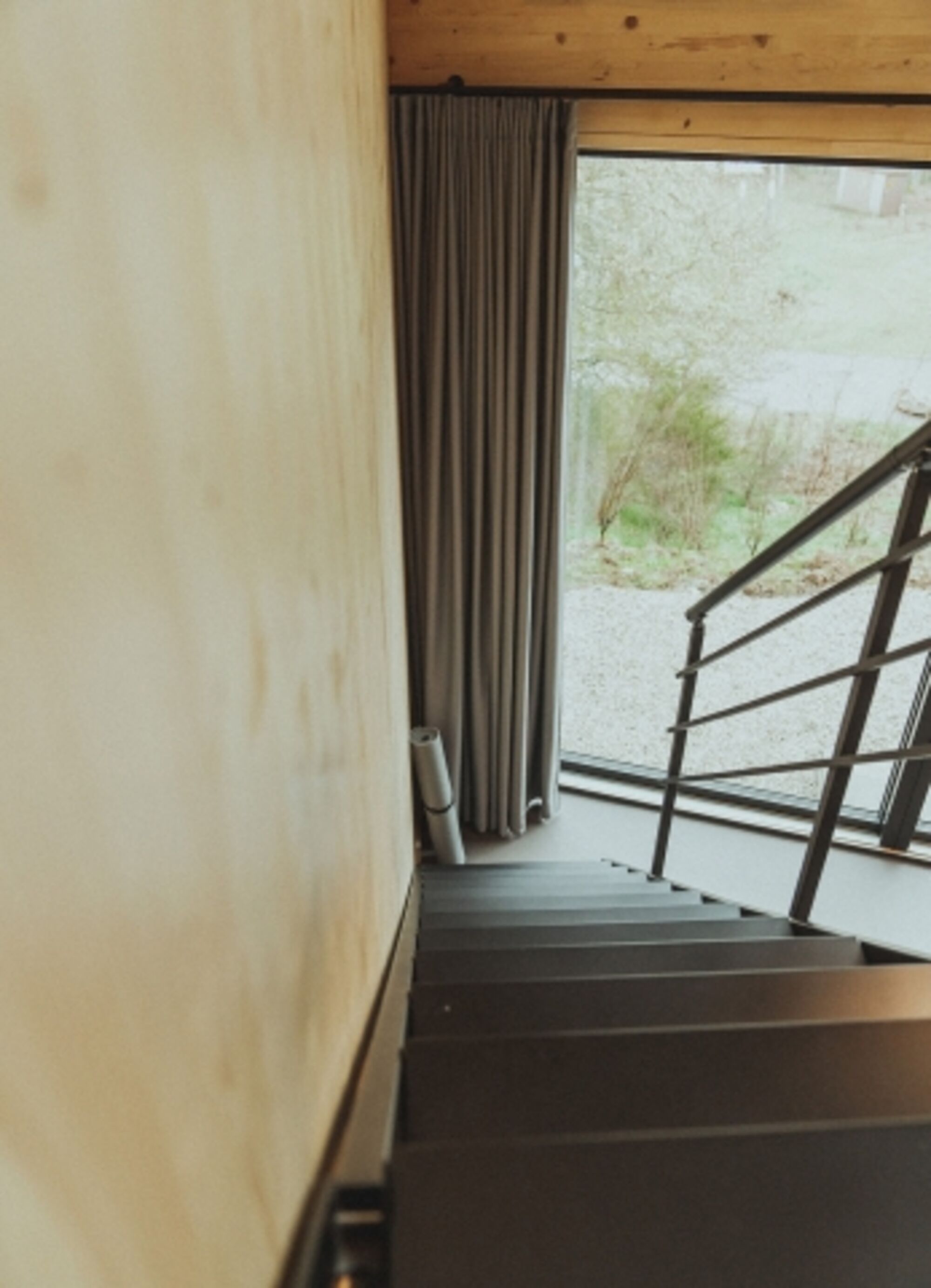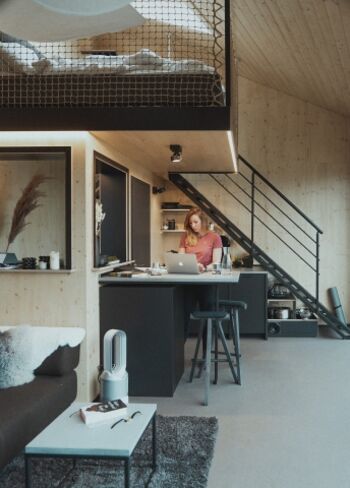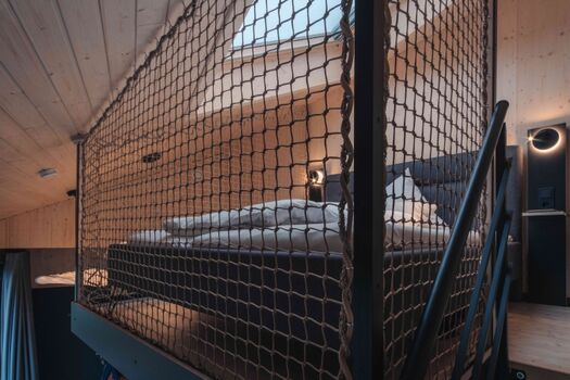Über eine Treppe gelangen Sie zur gemütlichen Schlafempore, wo dank großem Dachfenster weitere Naturspektakel auf Sie warten: Wolken- oder Sternenbeobachtungen vom Bett aus.