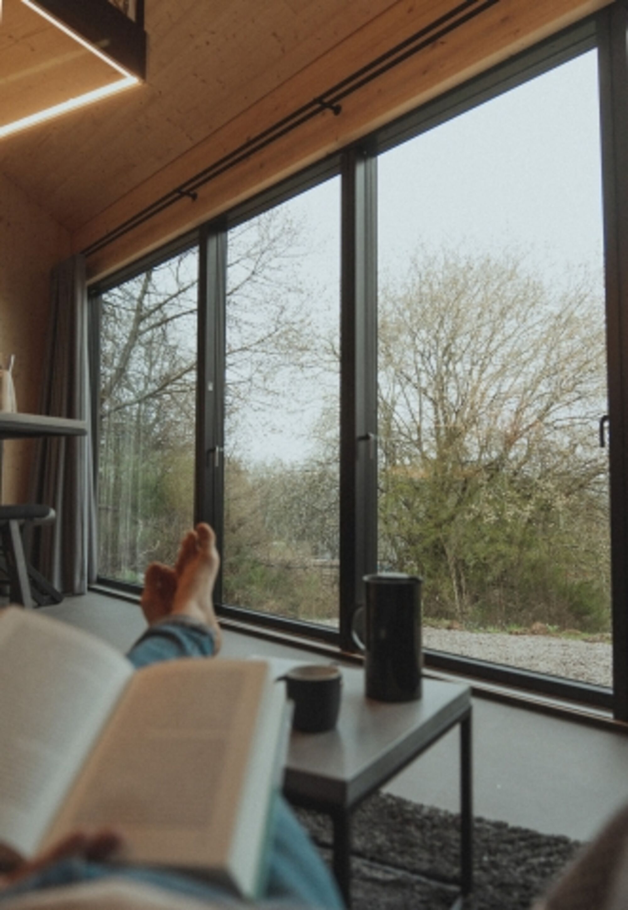 Freuen Sie sich auf einen Flatscreen der besonderen Art: Ein 6 Meter langes Panoramafenster sowie ein Dachflächenfenster über dem Bett!
