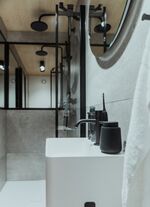 Waschbecken, Regendusche, Spiegel, Fenster im Bad