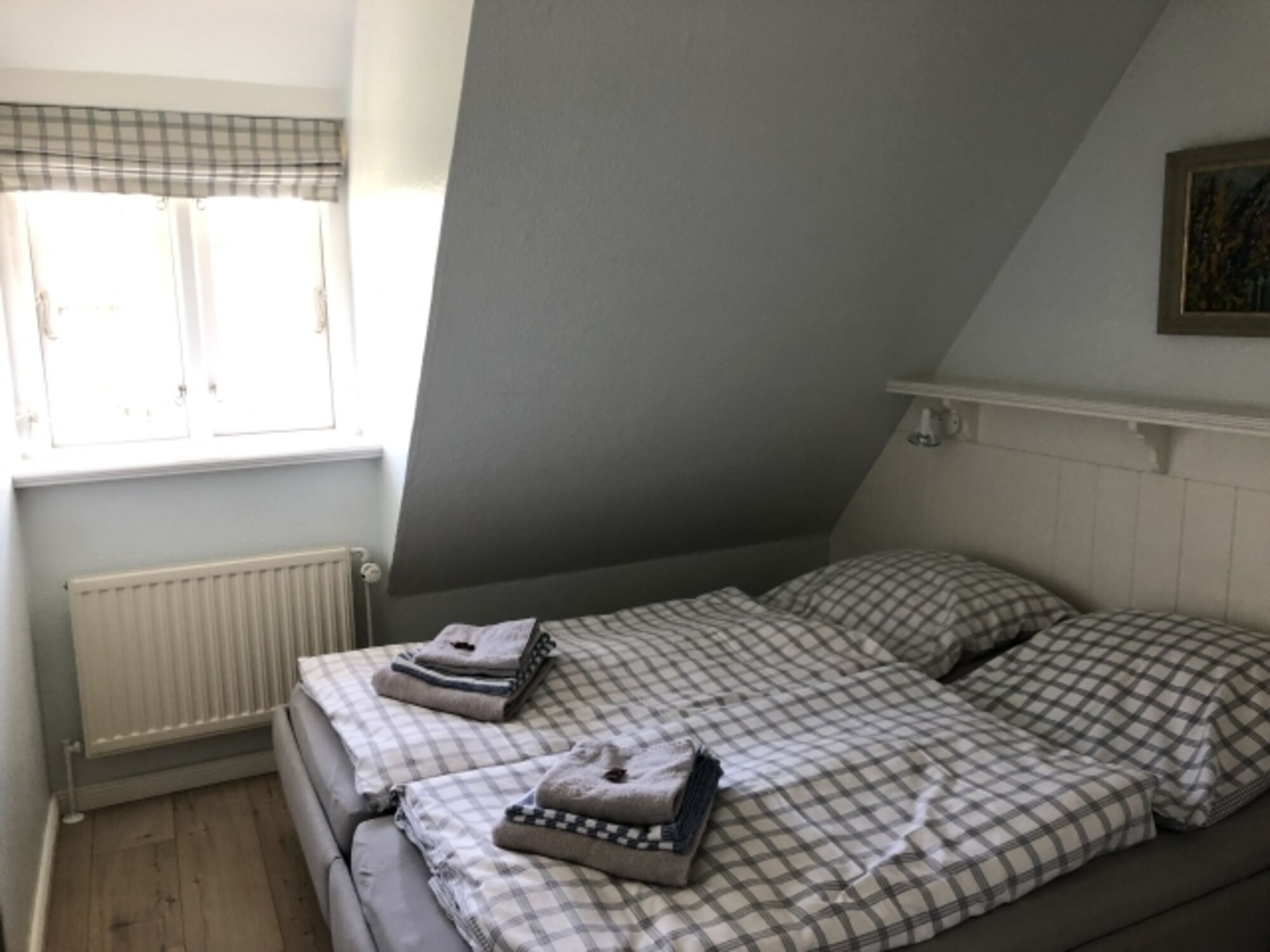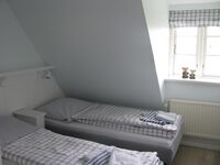 Im Obergeschoss unter den Schrägen des Reetdachs befinden sich die beiden heimeligen Schlafzimmer und ein helles Duschbad.