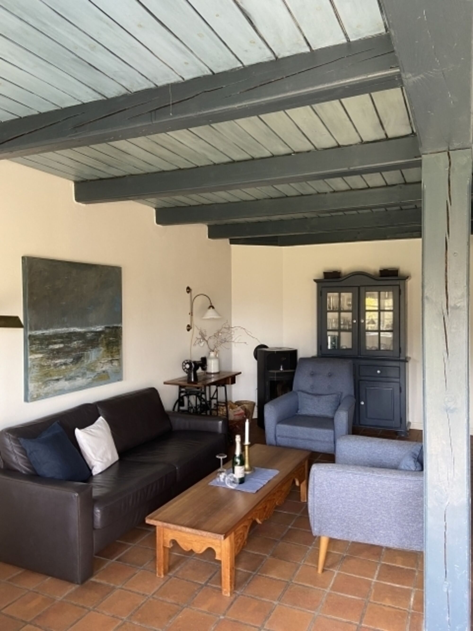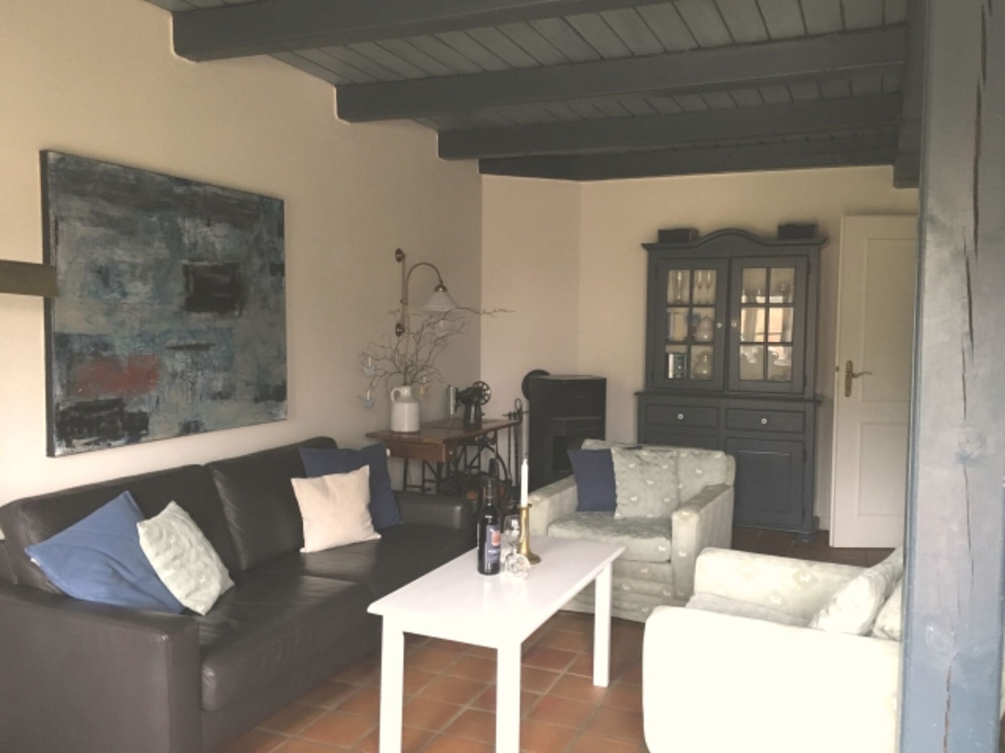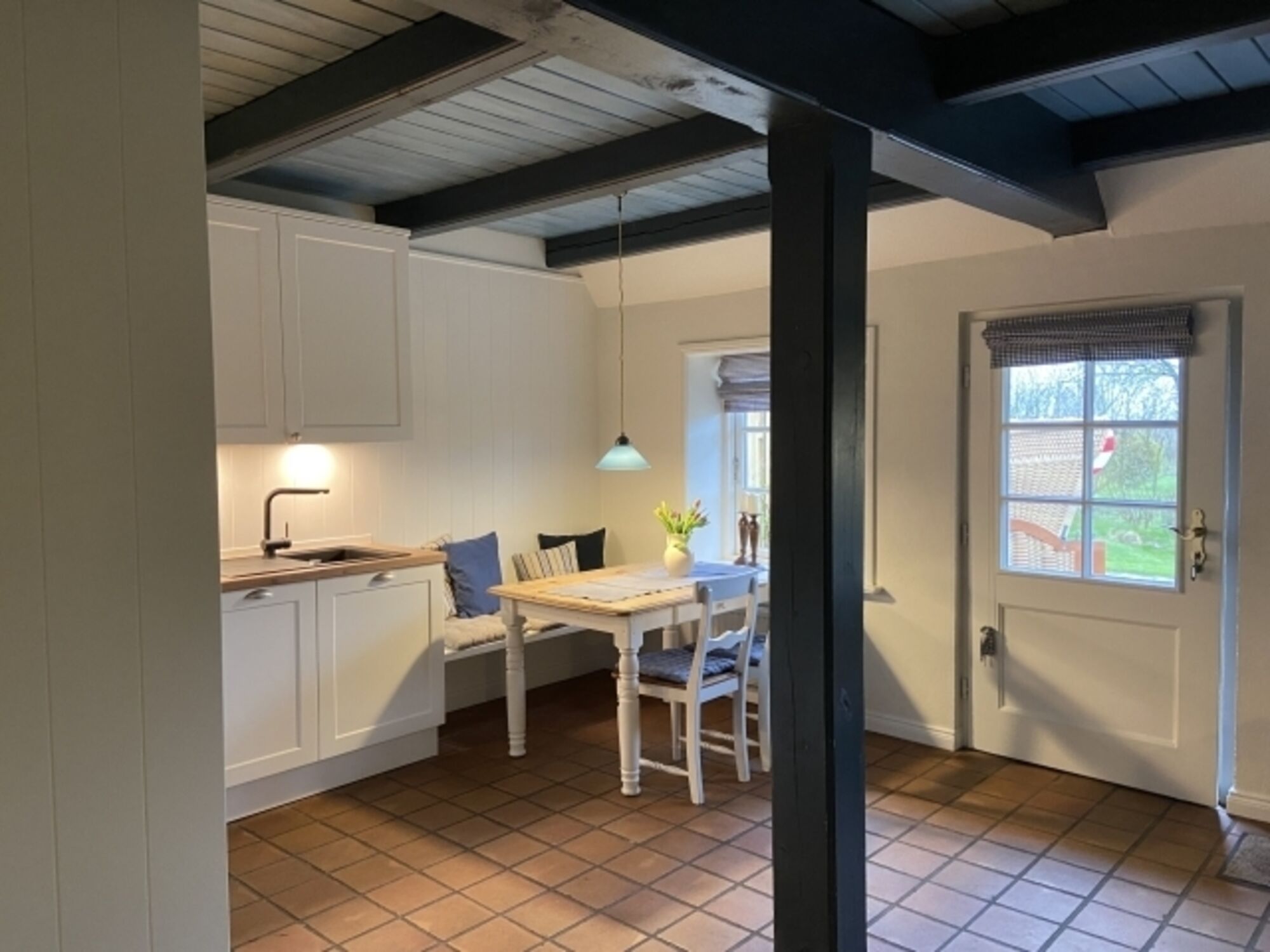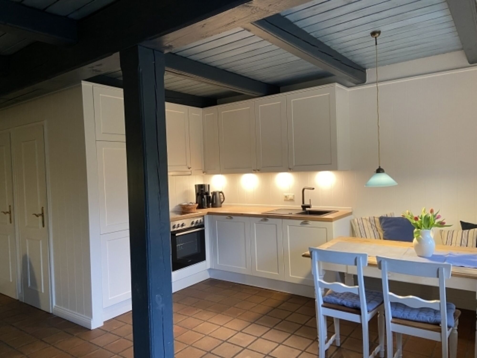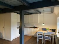 Im Erdgeschoss der ca. 50qm großen Wohnung befindet sich der Wohnbereich mit einer gemütlichen Sitzecke und SAT-TV. Typisch für ein Friesenhaus sind die offenen Holzbalkendecken und die antiken Bodenfliesen mit Fußbodenheizung. Ebenfalls im Erdgeschoss befindet sich die voll ausgestattete Küche und der schöne Essbereich.