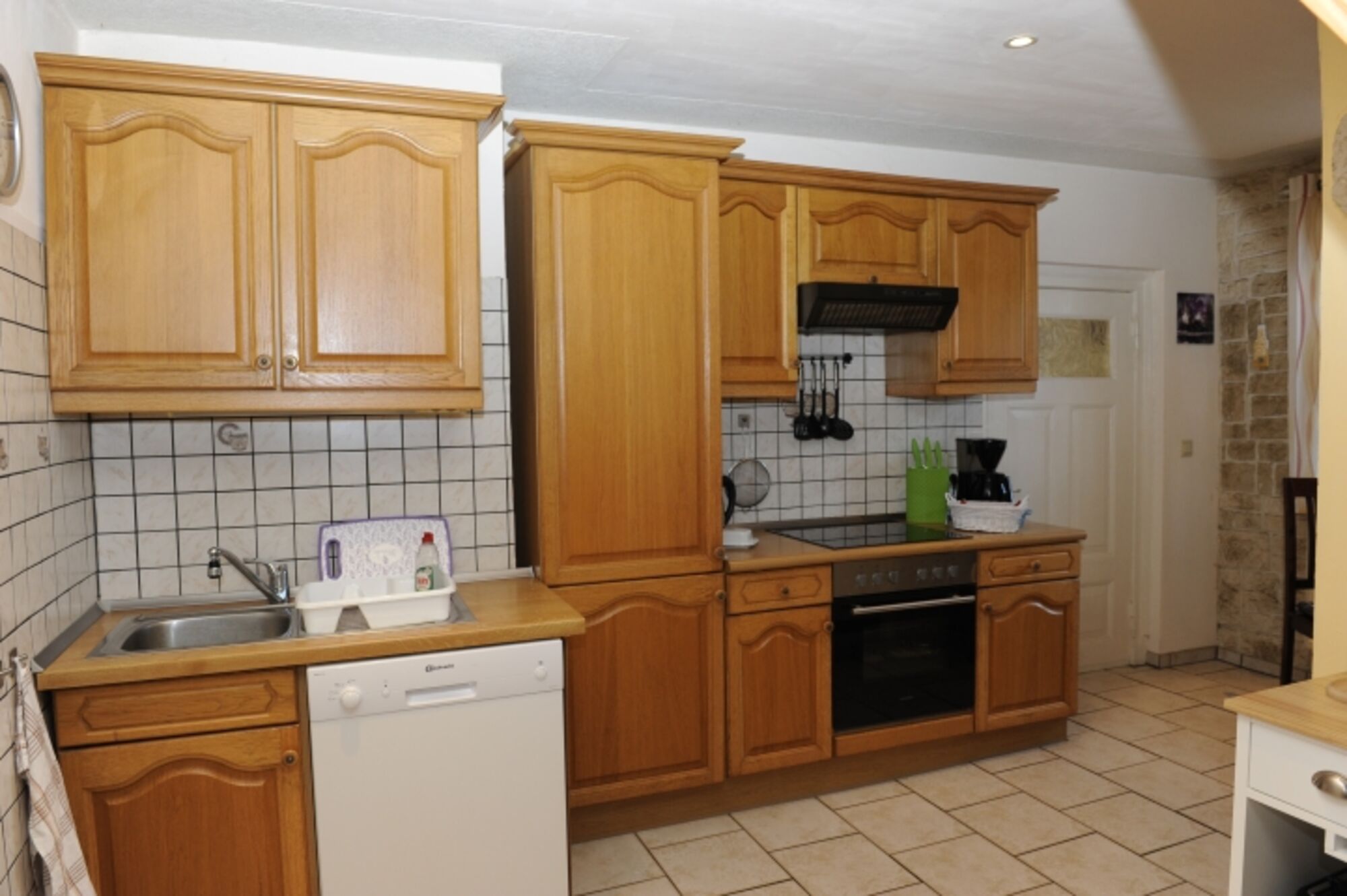 Cerankochfeld, Dunstabzugshaube, Kühlschrank mit Gefrierfach, Gefrierschrank, Eierkocher, Mixer, Korkenzieher / Flaschenöffner, Gewürze (Salz, Pfeffer, Zucker), Geschirrhandtücher, Mülltüten, Essplatz in der Küche