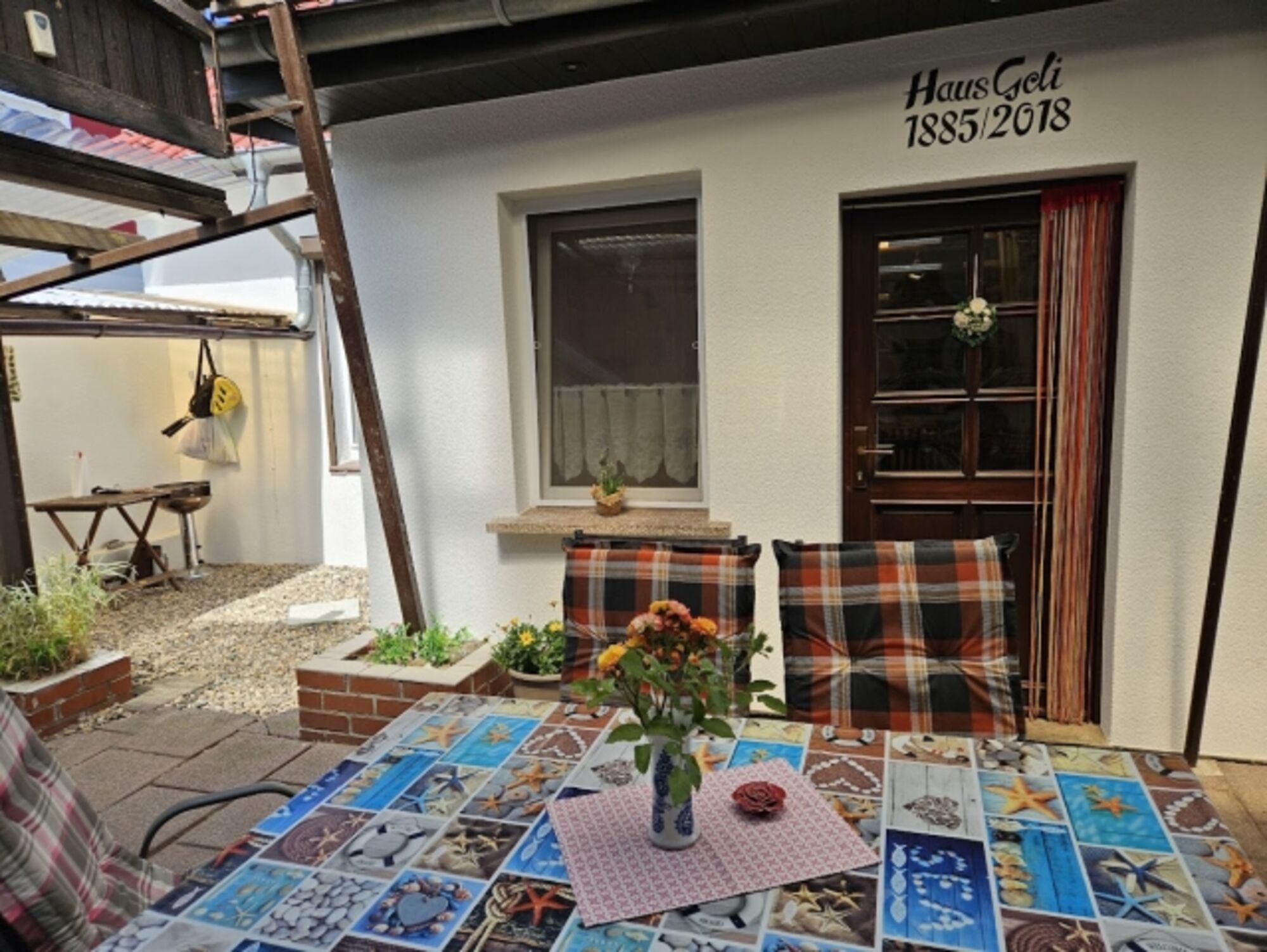 Liegewiese, Gartenmöbel, Bänke, Holzgrill, Hof