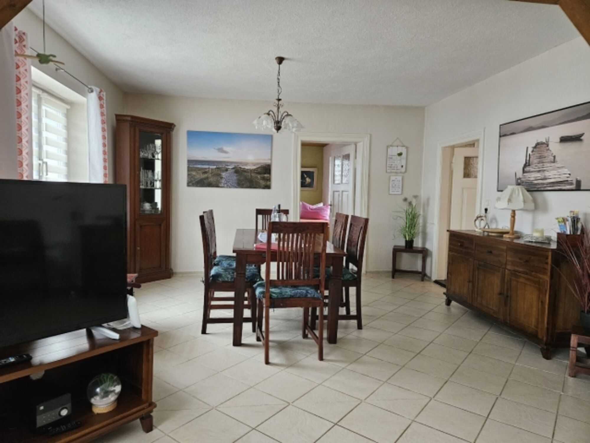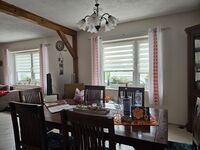 Das große Wohnzimmer im Erdgeschoß hat einen zusätzlichen Essbereich. Die Wohnlandschaft mit 2 Ottomanen ist sehr bequem, so können Sie nach einem ereignisreichen Urlaubstag die Beine gemütlich hochlegen.