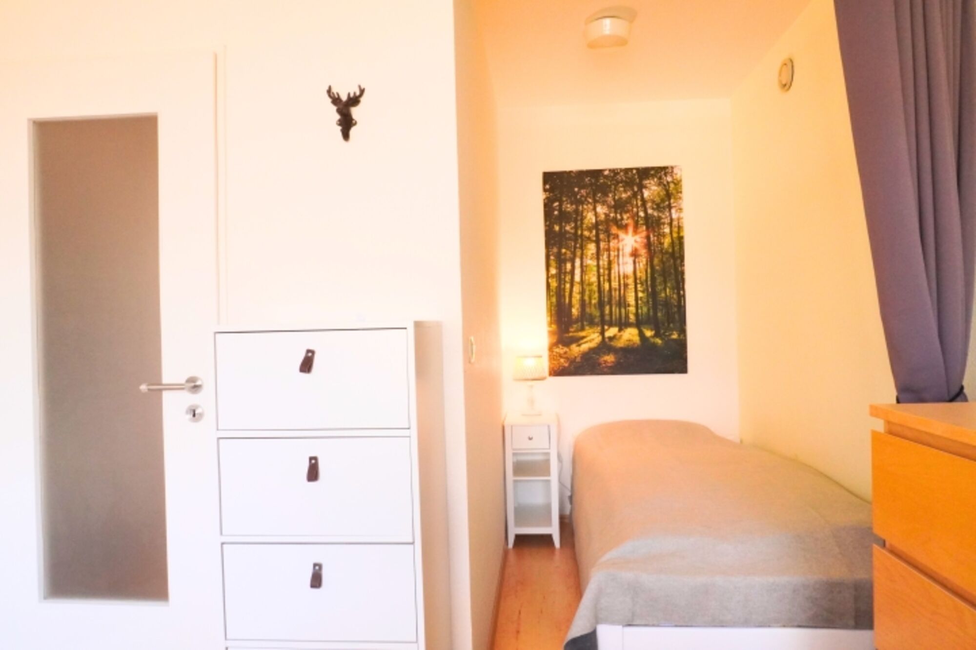 Genieße Deinen Urlaub in einer großzügigen, hellen Ferienwohnung mit zwei Schlafzimmern, zwei Badezimmern und zwei Balkonen – ideal für Familien, Freunde und Hundebesitzer. Insgesamt stehen fünf komfortable Betten zur Verfügung – genug Raum für alle! Euren Hund heißen wir gerne willkommen - ohne Aufpreis. Bitte beachte, dass die Wohnung sich im 4. Obergeschoss befindet. Es ist ein Aufzug vorhanden. Der Weg vom Apartment zum Aufzug ist ca. 50 Meter lang.