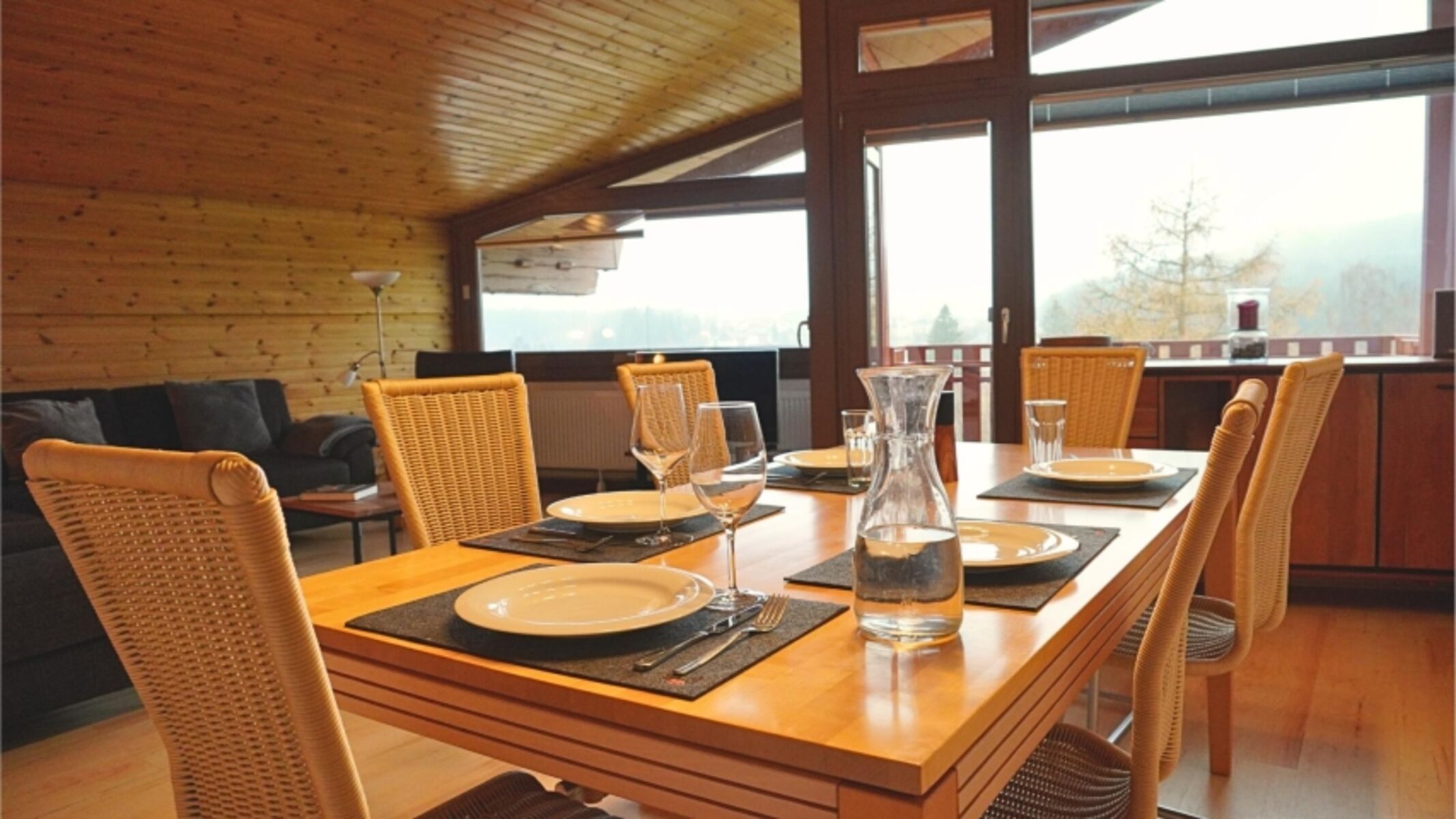 Entspanne Dich im gemütlichen Wohnzimmermit Panoramafenster oder koche gemeinsam in der voll ausgestatteten Küche mit Spülmaschine, Mikrowelle und Ofen. Die Wohnung liegt im 4. Stock des Ferien-Ressorts Kruhotel Schluchsee und ist bequem per Aufzug erreichbar. Kostenlose Parkplätze stehen direkt am Haus zur Verfügung.