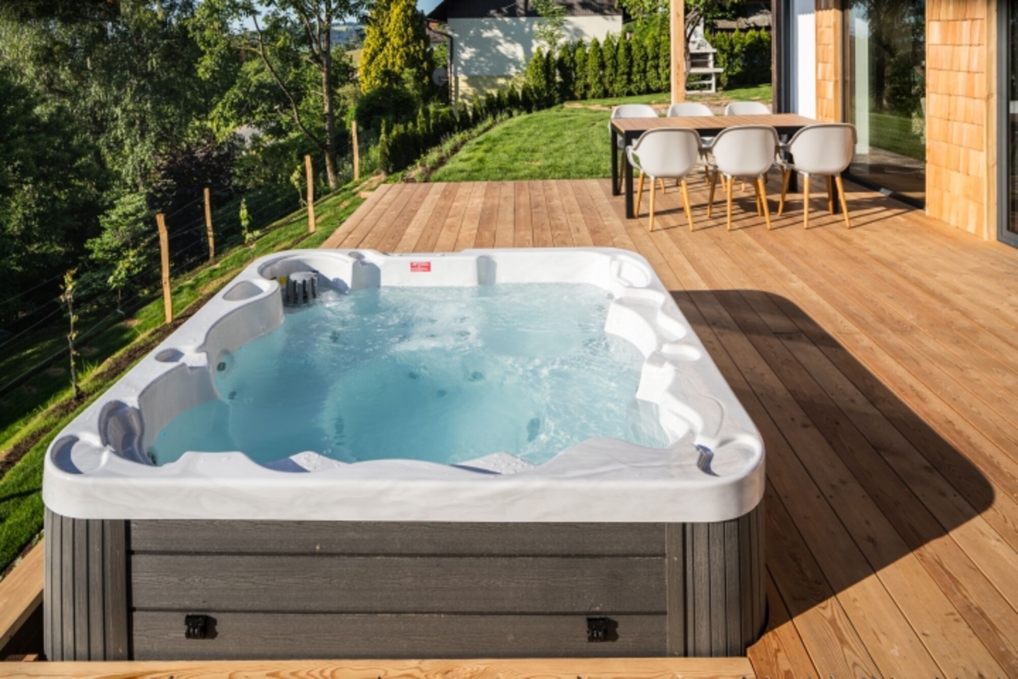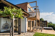 Egal ob im Whirlpool, der Panoramasauna oder dem Schlafzimmer: Aus jedem Winkel kann man das unglaubliche Panorama der Südweststeiermark auf sich wirken lassen. Das Schilcherhaus bietet ein Wohlfühlambiente, zusammengesetzt aus spürbarer Liebe zum Detail der stilvoll gestalteten Räumlichkeiten bis hin zu mit Hand verarbeiteten Holzschindeln, welche die einzigartige Fassade schmücken.