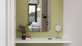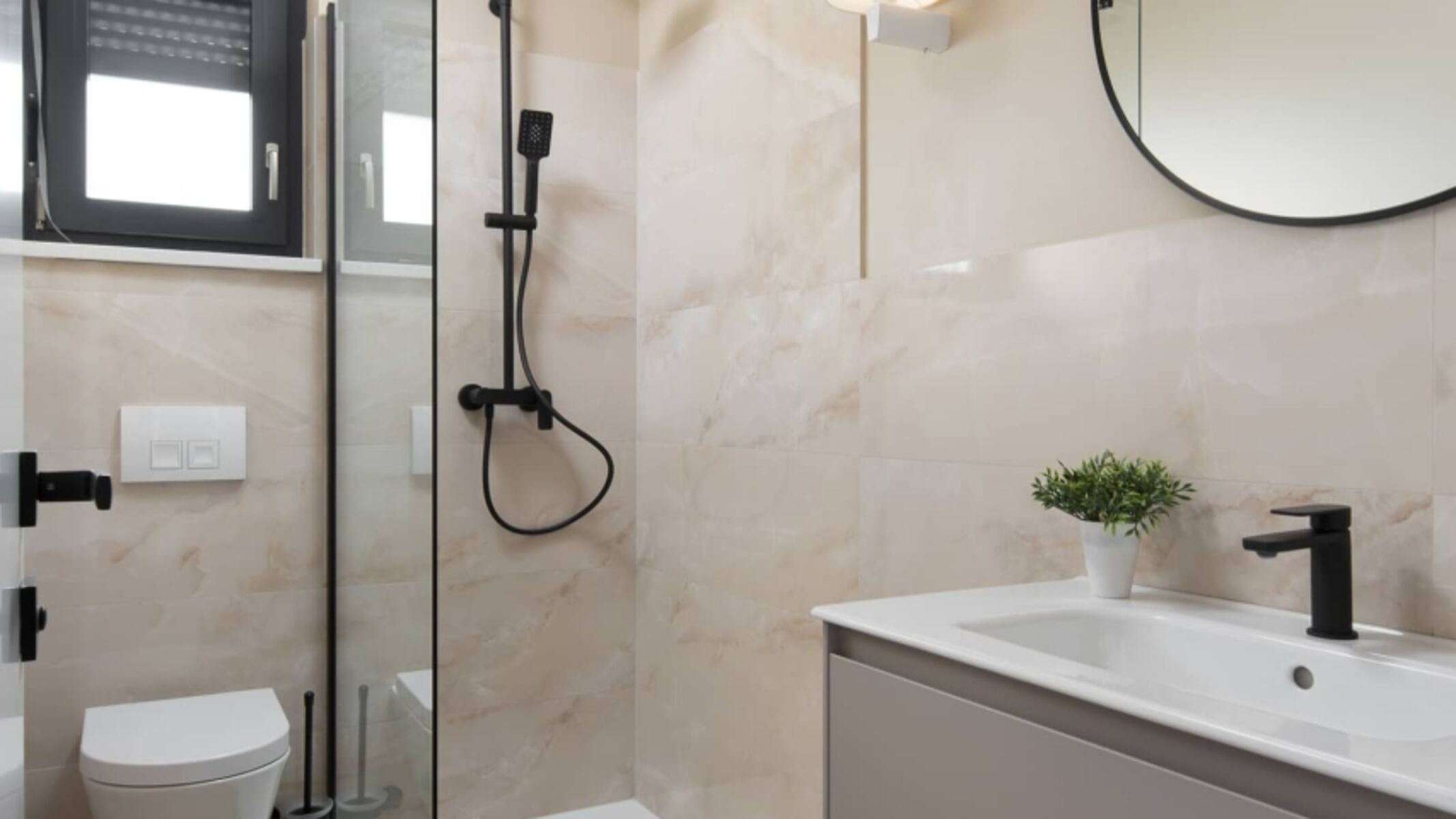 Waschbecken, Spiegel, Fenster im Bad