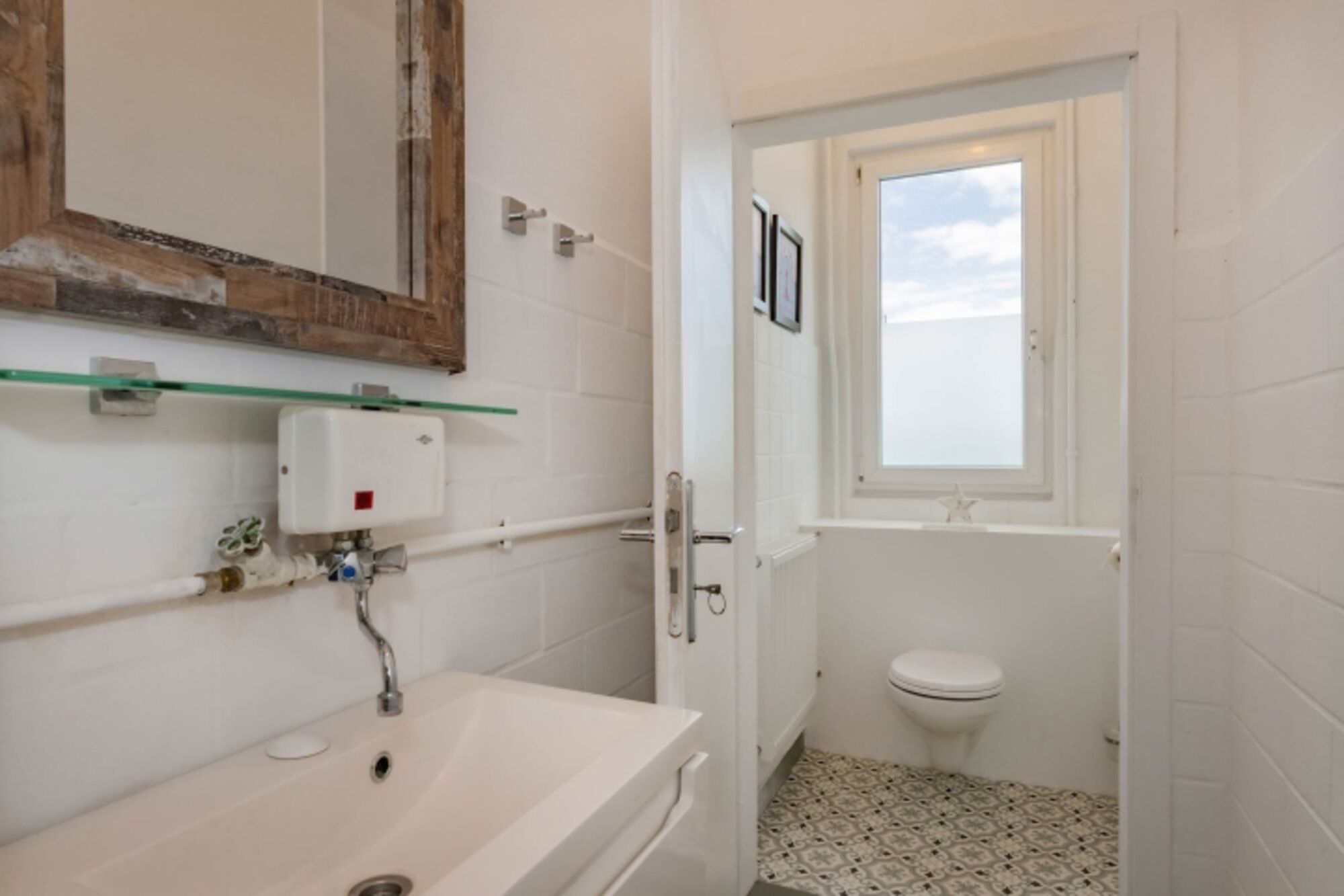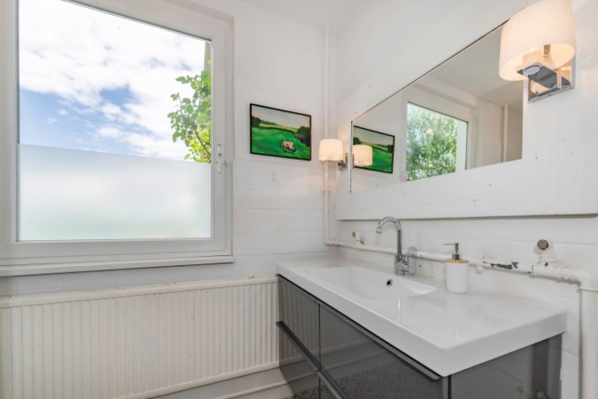Zusätzlich gibt es ein weiteres großes Badezimmer mit Wanne, Dusche, WC und breitem Handwaschbecken. Hier können Sie warme Duschen & Bäder genießen. Aus dem Handwaschbecken hier läuft kein Warm-Wasser. Waschbecken, Spiegel