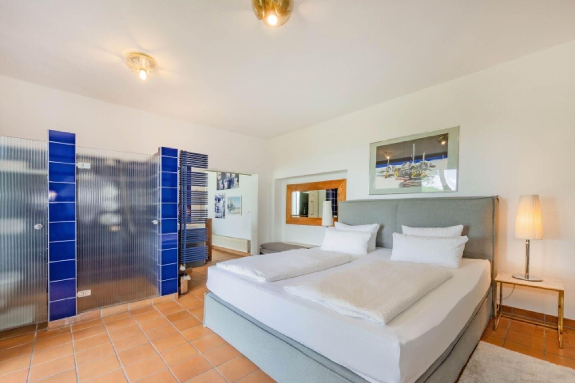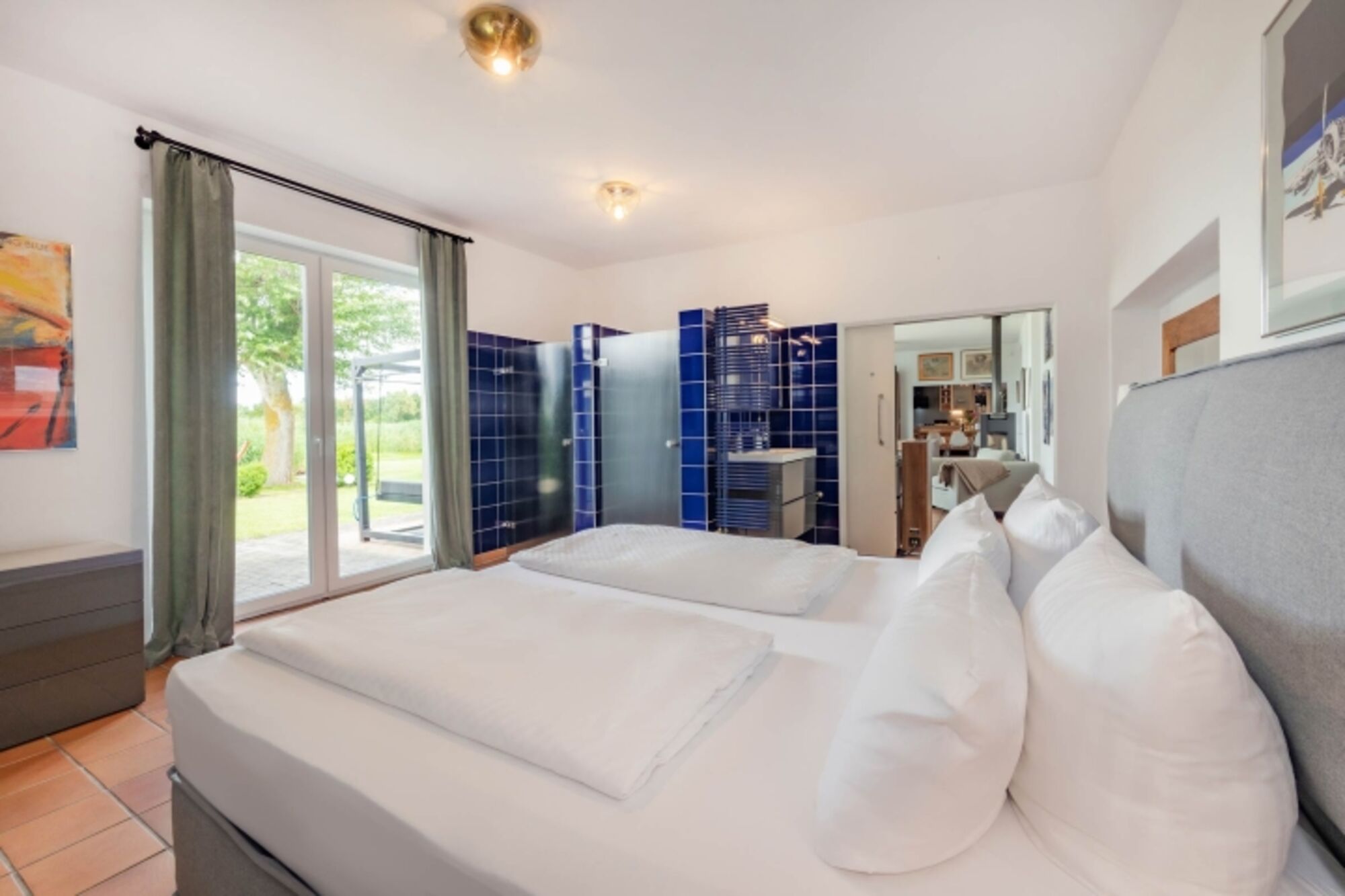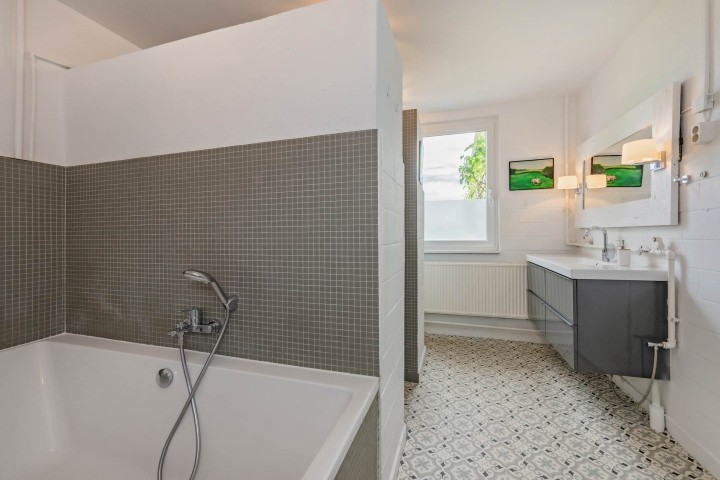 Ein Badezimmer mit Dusche befindet sich direkt in einem der Schlafzimmer, ein weiteres großes Badezimmer mit Wanne und Dusche sowie ein separates Gäste-WC sorgen für genügend Privatsphäre innerhalb des Hauses, welches sich komplett auf einer Ebene im EG befindet.