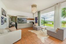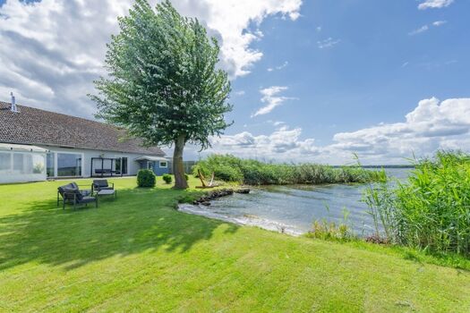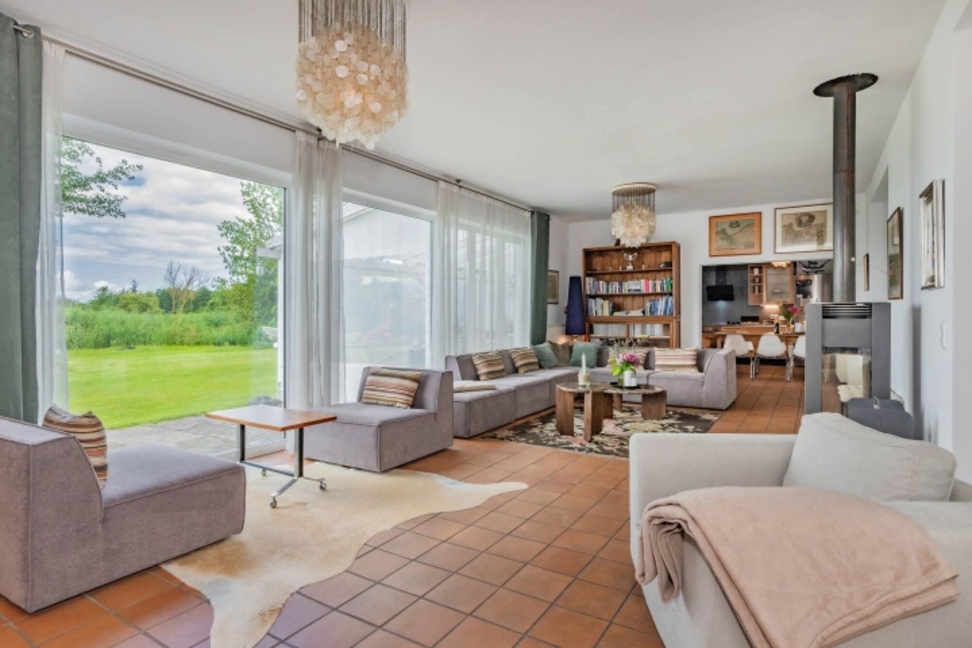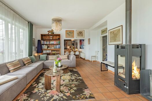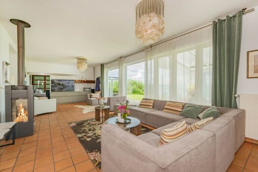 Das 45qm große, helle Wohnzimmer mit XXL-Couch Landschaft, Kamin und TV - mit Blick in den Garten und aufs Wasser - lädt zum gemütlichen Beisammensein in großer Runde ein. Über die offene, vollausgestattete Küche, haben Sie Zugang zur Terrasse mit großzügiger Sitzmöglichkeit und zum Garten.