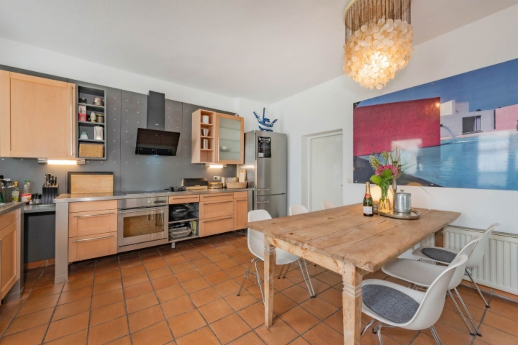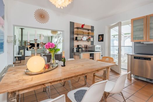 4-Platten Herd, Cerankochfeld, Dunstabzugshaube, Kühlschrank mit Gefrierfach, Nespresso-Automat, Mixer, Korkenzieher / Flaschenöffner, Geschirrhandtücher, Mülltüten, Essplatz in der Küche