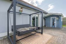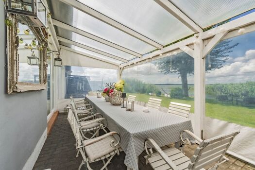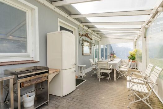 Die überdachte, windgeschützte Terrasse ist ausreichend möbliert und lädt zum Abendessen in großer Runde ein. Ein Grill und eine Feuerschale stehen ebenfalls bereit.