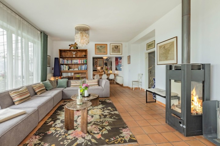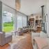 Das 45qm große, helle Wohnzimmer mit XXL-Couch Landschaft, Kamin und TV - mit Blick in den Garten und aufs Wasser - lädt zum gemütlichen Beisammensein in großer Runde ein.
