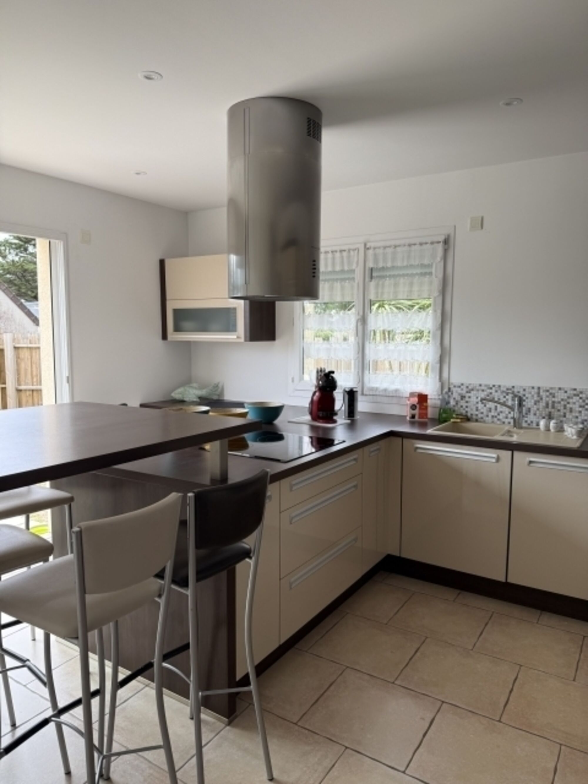 Induktionsherd, Dunstabzugshaube, Kühlschrank mit Gefrierfach, Kaffeevollautomat, Mixer, Korkenzieher / Flaschenöffner, Geschirrhandtücher, Mülltüten, Essplatz in der Küche