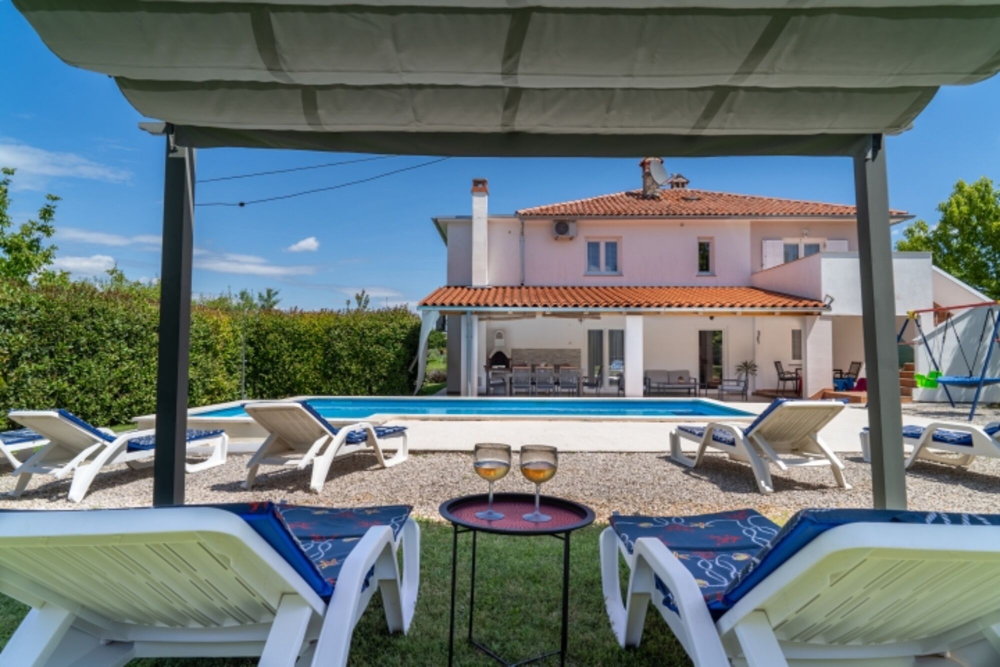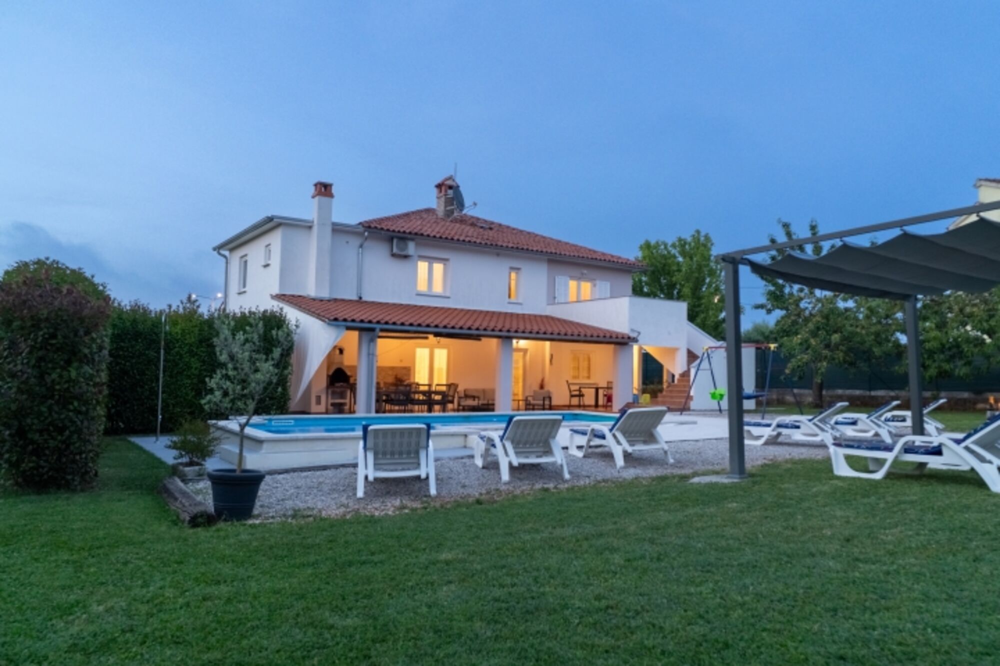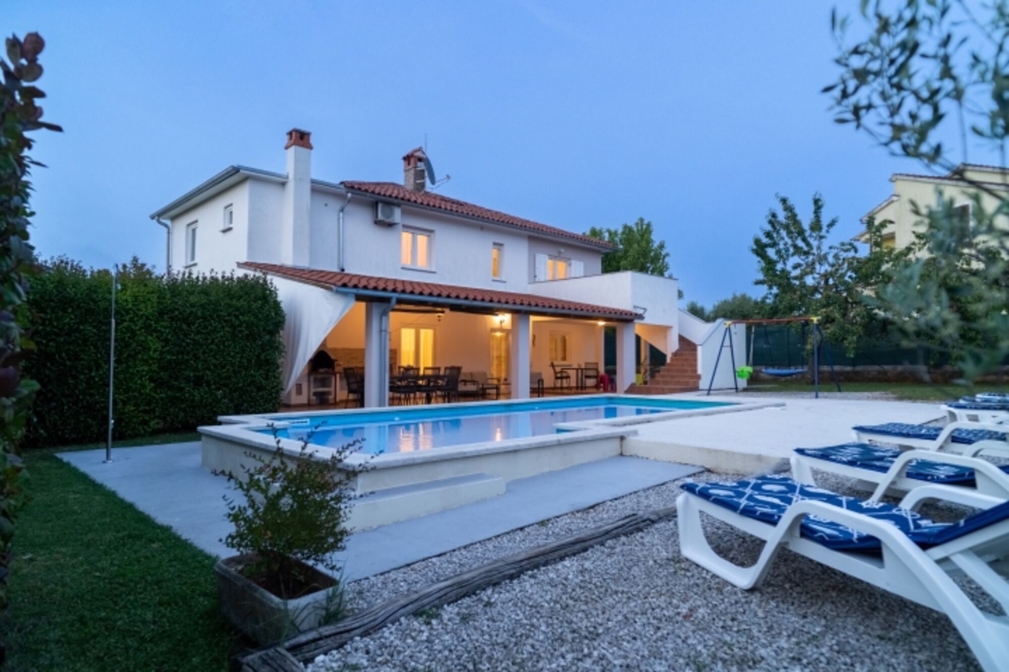 Genießen Sie sonnige Tage am privaten Pool, der von einem großzügigen Garten umgeben ist – perfekt zum Entspannen, gemeinsamen Essen oder gemütlichen Beisammensein im Freien. Für aktive Gäste stehen Tischtennis, Billard und Dart zur Verfügung, während sich die Kleinsten auf dem Spielplatz mit Trampolin und Schaukeln vergnügen können.