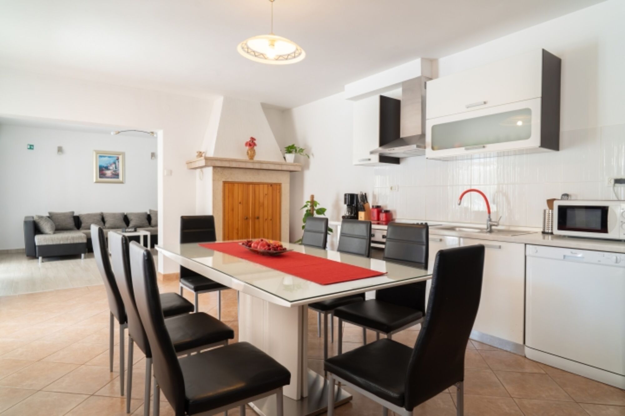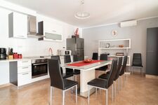 Cerankochfeld, Dunstabzugshaube, Kühlschrank mit Gefrierfach, Geschirrhandtücher, Essplatz in der Küche