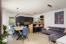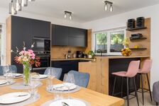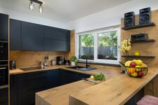 Induktionsherd, Dunstabzugshaube, Kühlschrank mit Gefrierfach, Geschirrhandtücher, Essplatz in der Küche