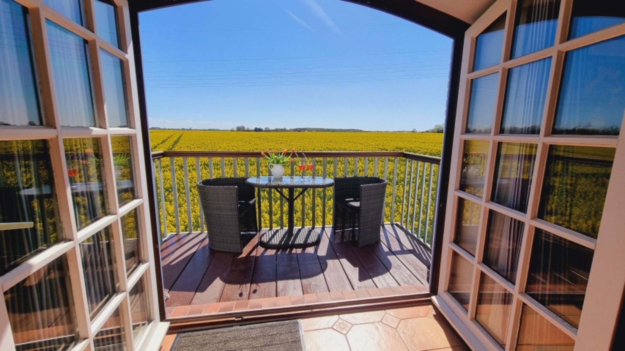 Den Blick in die Weite der wunderschönen gelben Rapsfelder erwartet Sie in der Ferienwohnung Schleiperle. Die Ferienwohnung unter einem Reetdach liegt am Rande von Kappeln in ruhiger Lage.