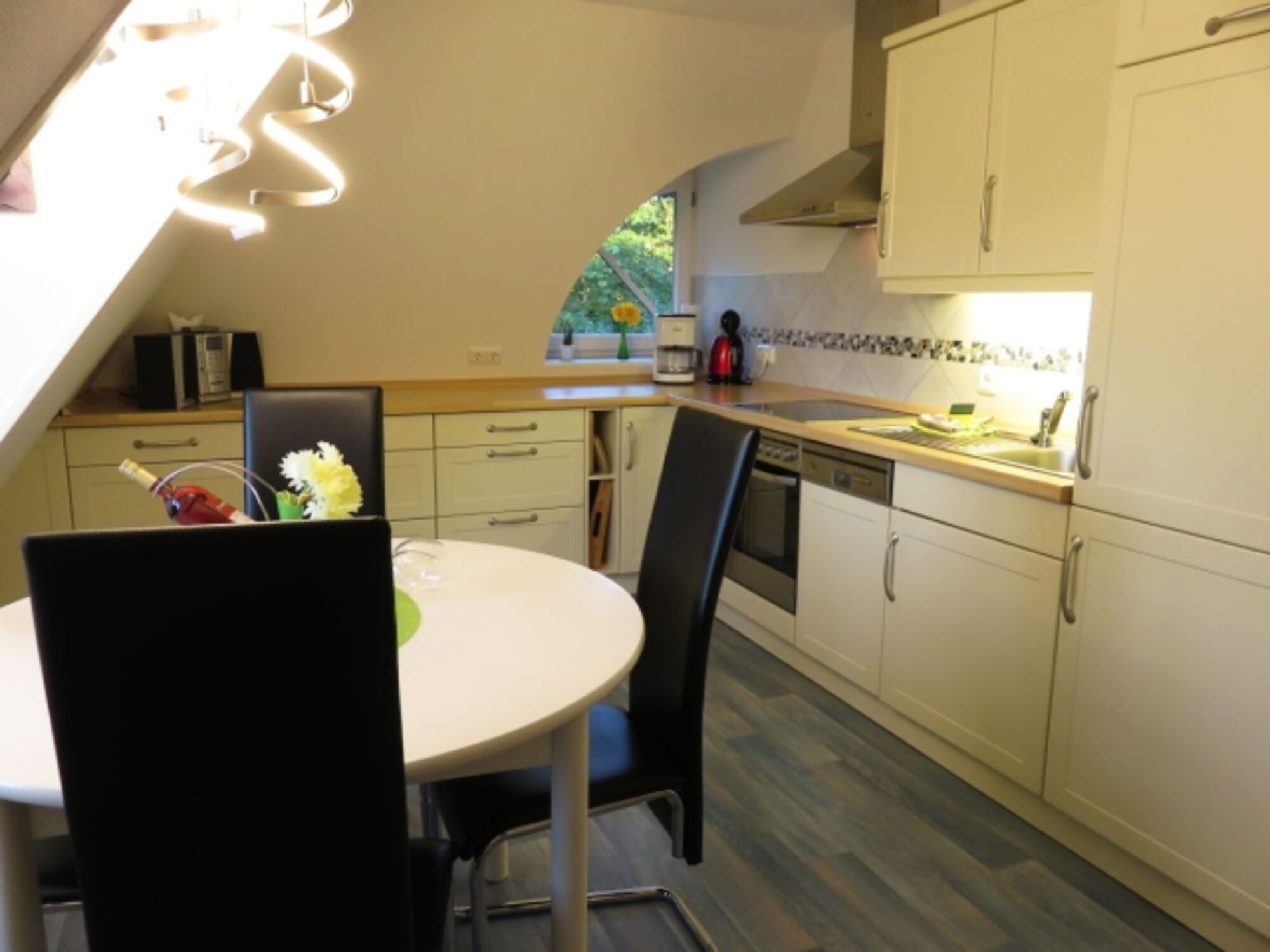 4-Platten Herd, Cerankochfeld, Dunstabzugshaube, Kühlschrank mit Gefrierfach, Eierkocher, Korkenzieher / Flaschenöffner, Geschirrhandtücher, Essplatz in der Küche