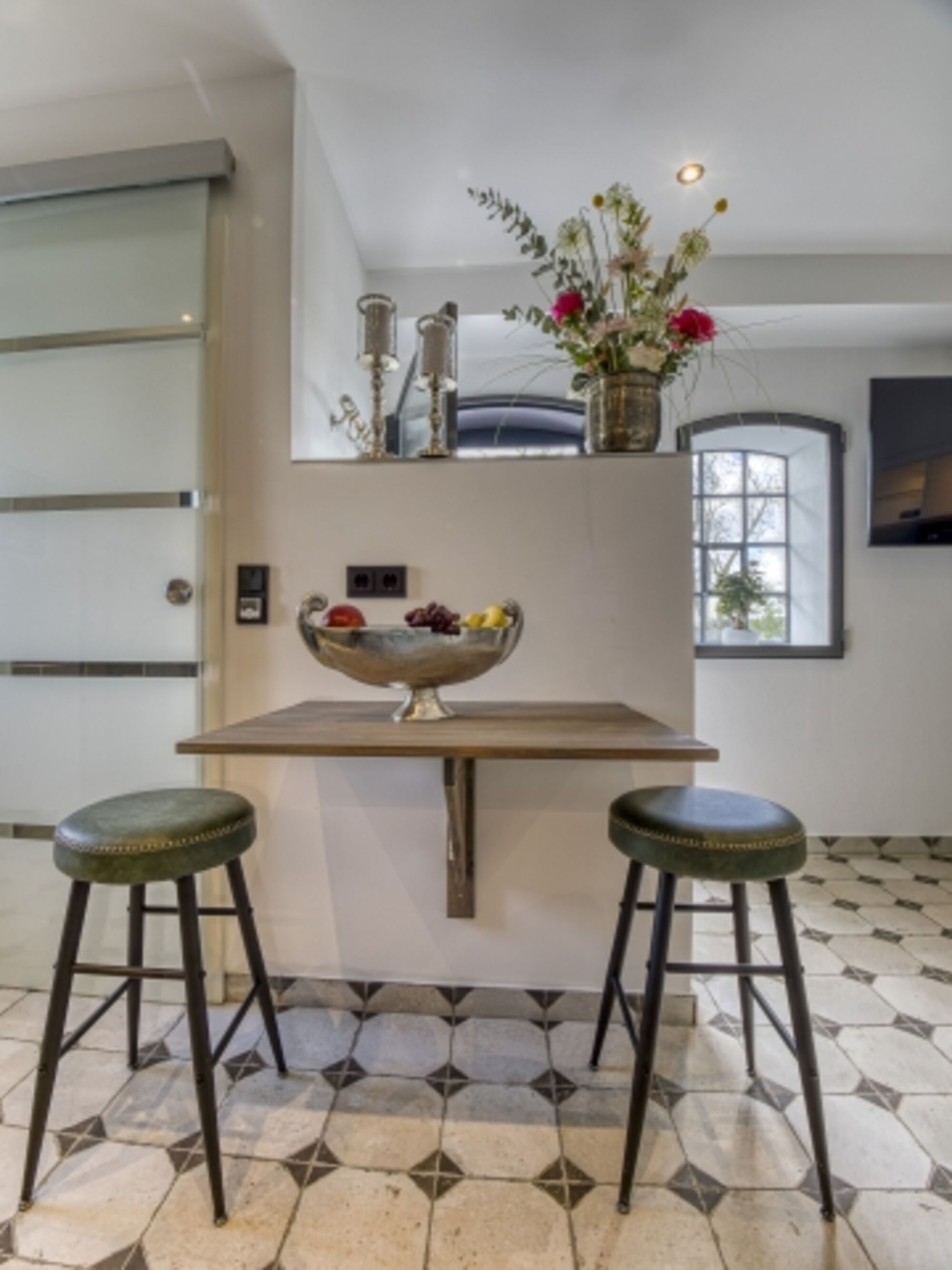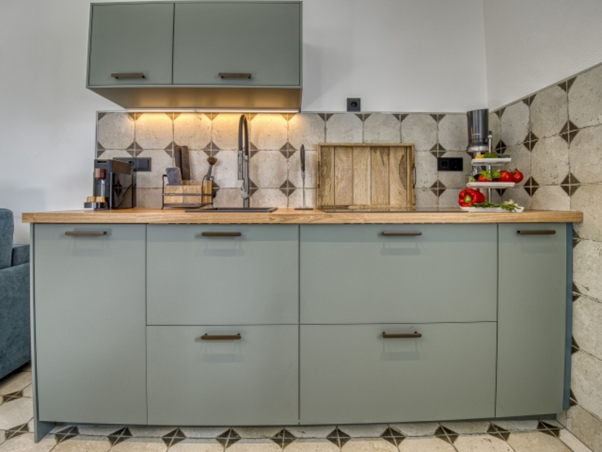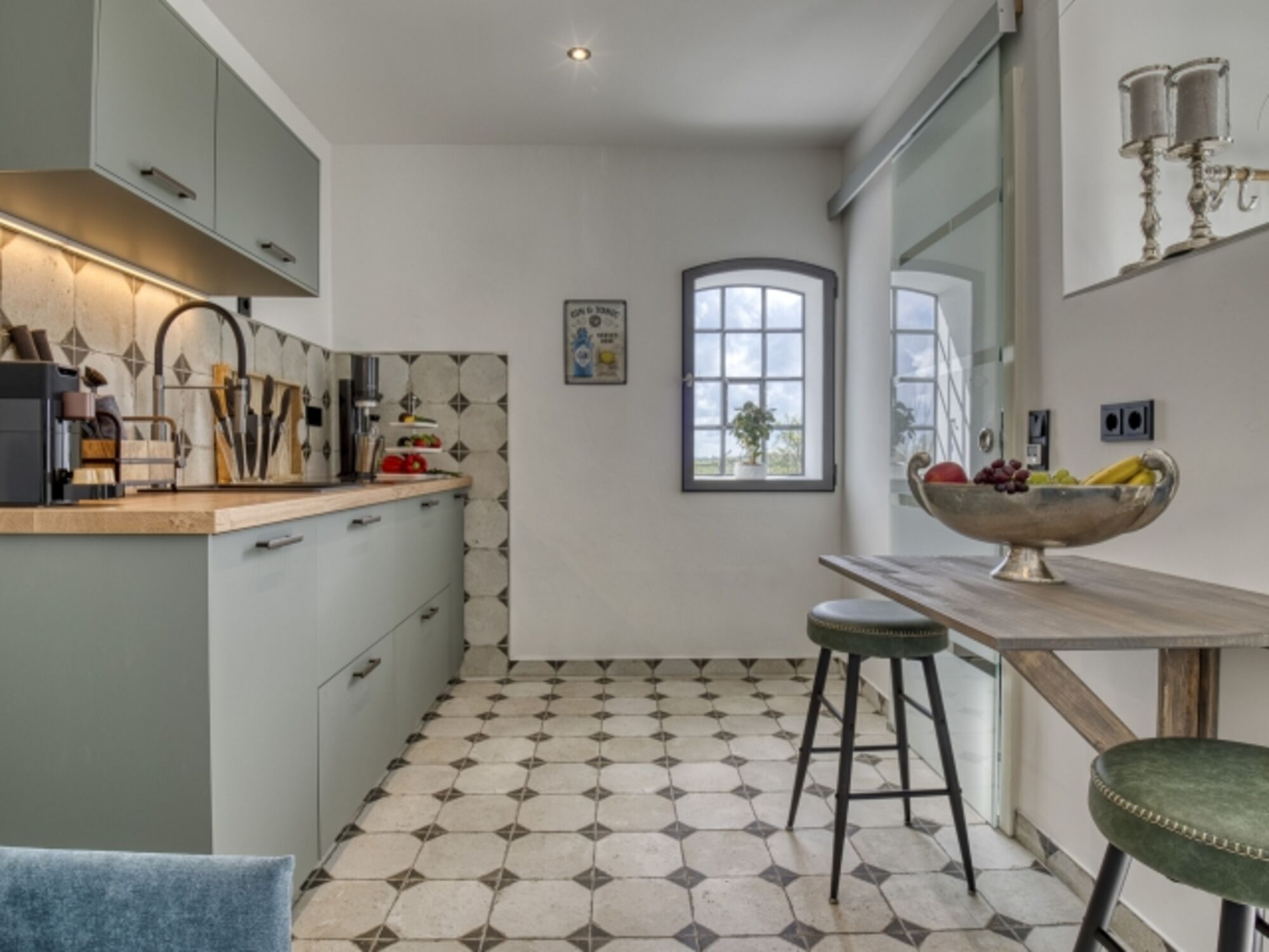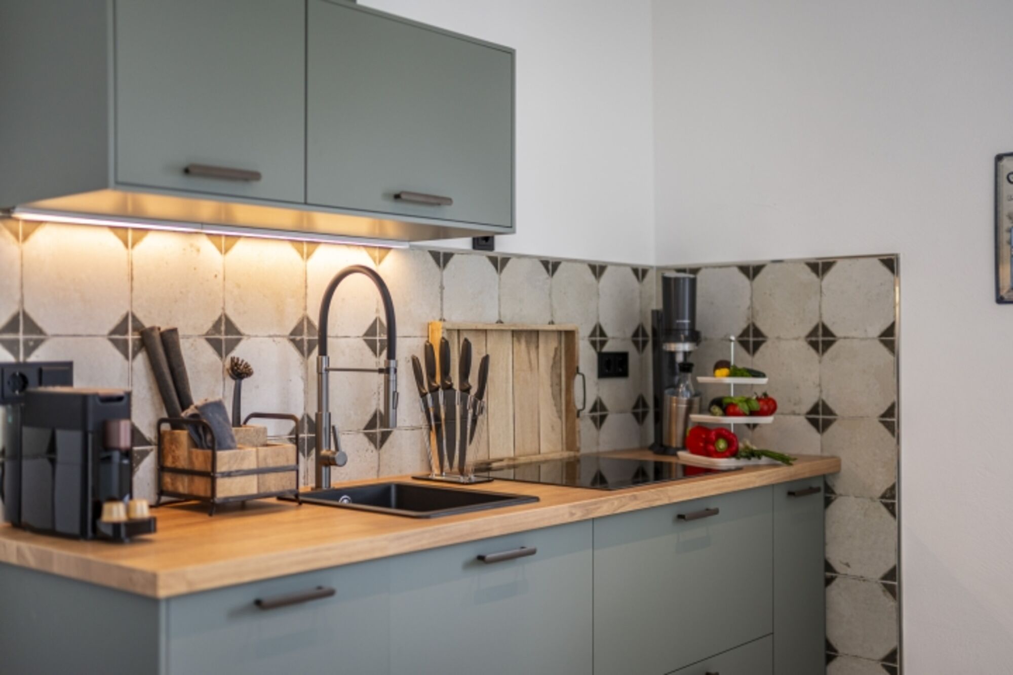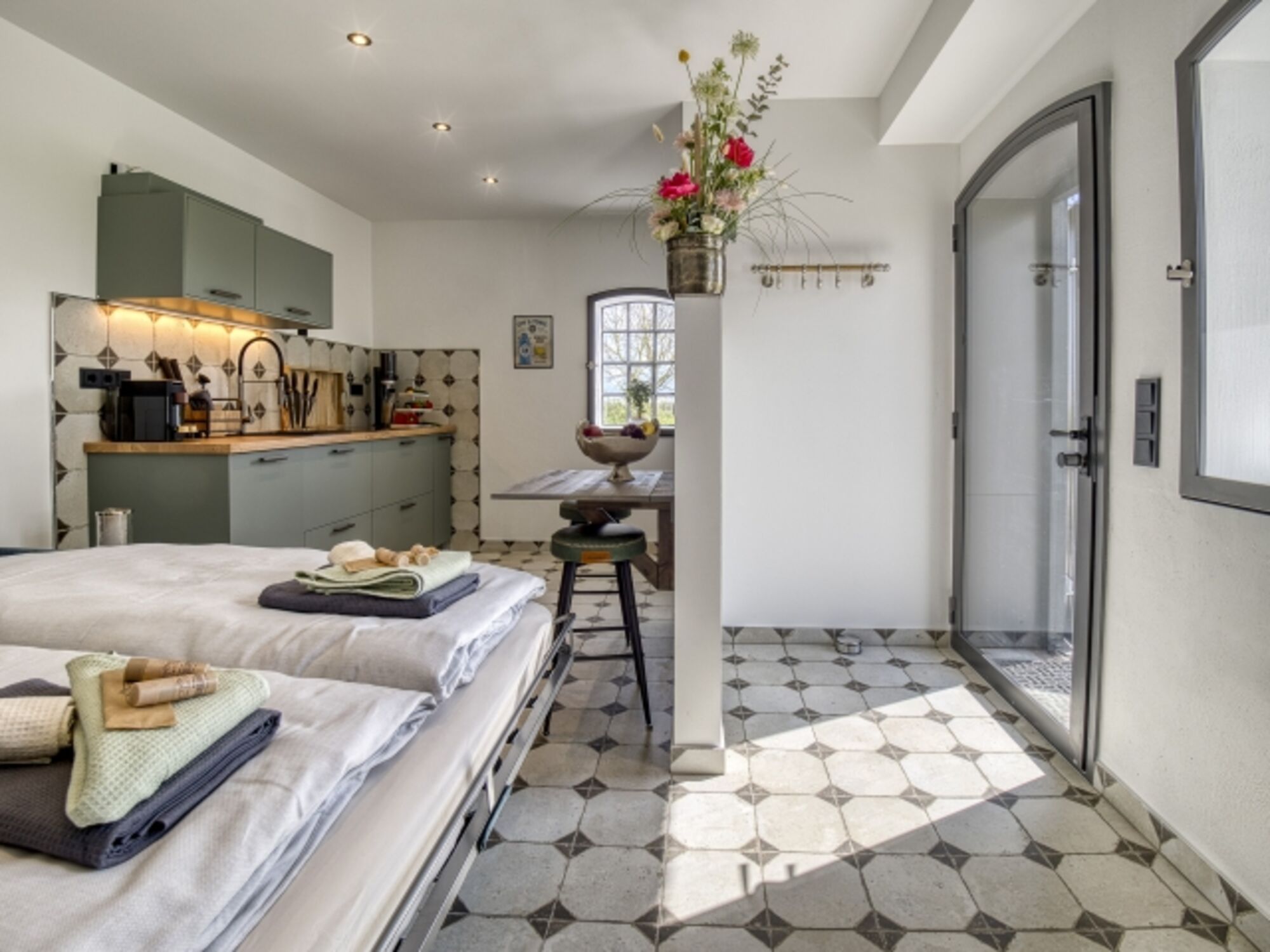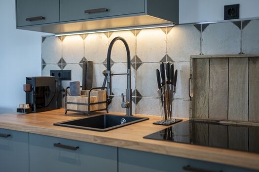 Induktionsherd, Kühlschrank mit Gefrierfach, Gefrierschrank, Nespresso-Automat, Korkenzieher / Flaschenöffner, Geschirrhandtücher, Mülltüten, Essplatz in der Küche, TV in der Küche