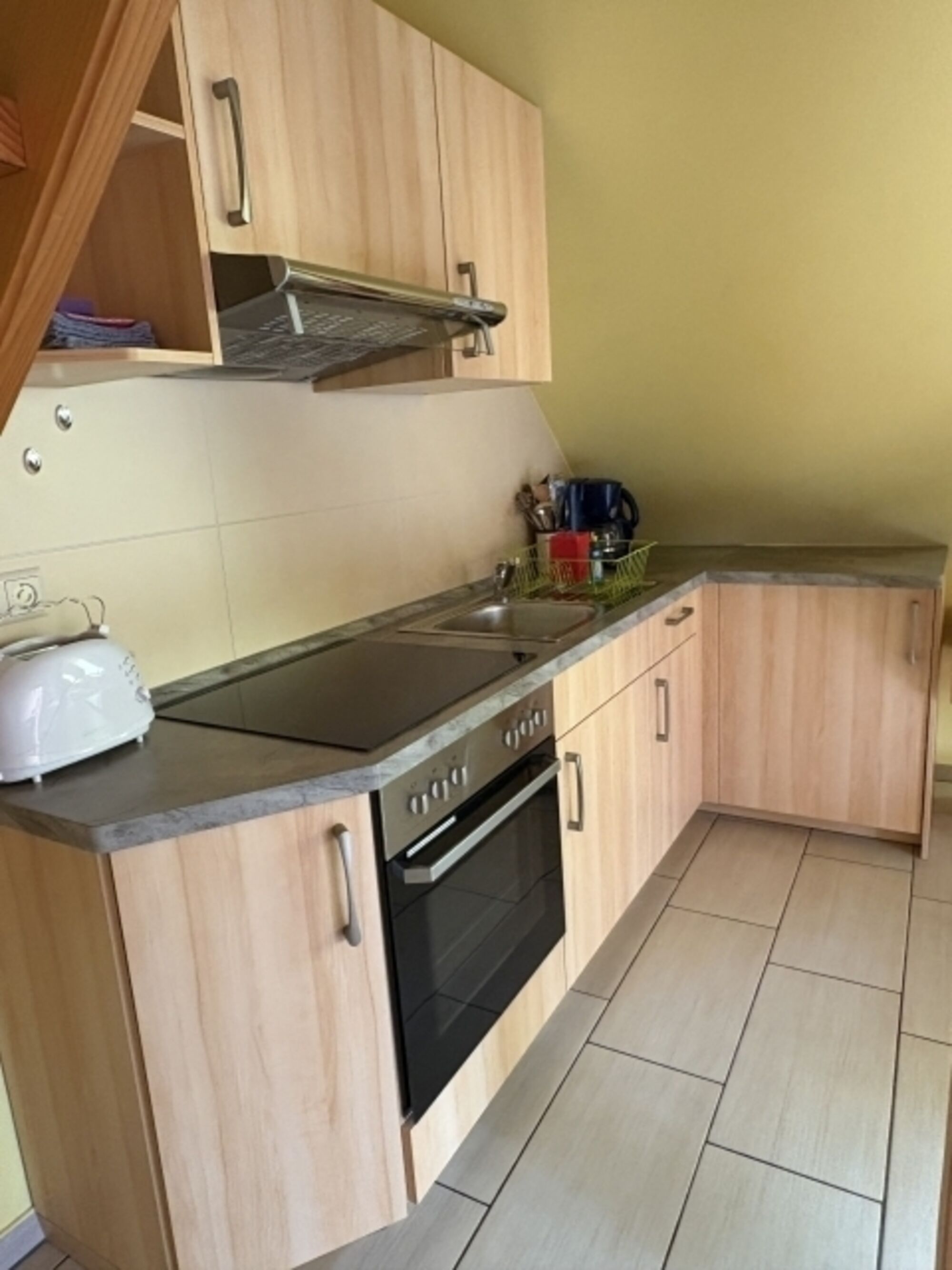 4-Platten Herd, Cerankochfeld, Dunstabzugshaube, Kühlschrank mit Gefrierfach, Eierkocher, Korkenzieher / Flaschenöffner, Gewürze (Salz, Pfeffer, Zucker), Geschirrhandtücher, Mülltüten