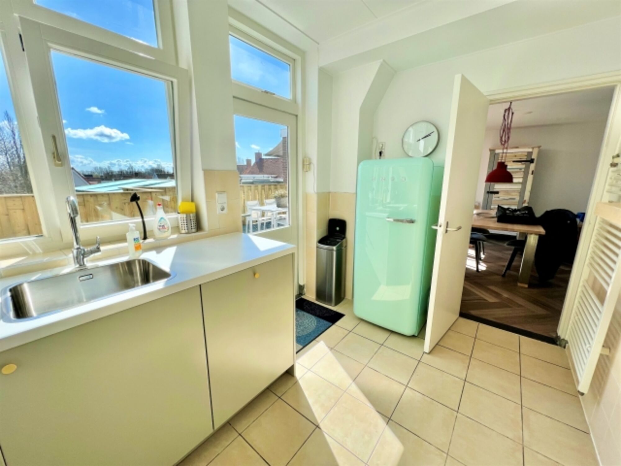 Die neue Küche ist mit allem ausgestattet, was Sie brauchen: Spülmaschine, großer Kühl- und Gefrierschrank, Ofen, Wasserkocher, Nespresso- und Filterkaffeemaschine. Eine separate Gästetoilette befindet sich ebenfalls auf dieser Etage.