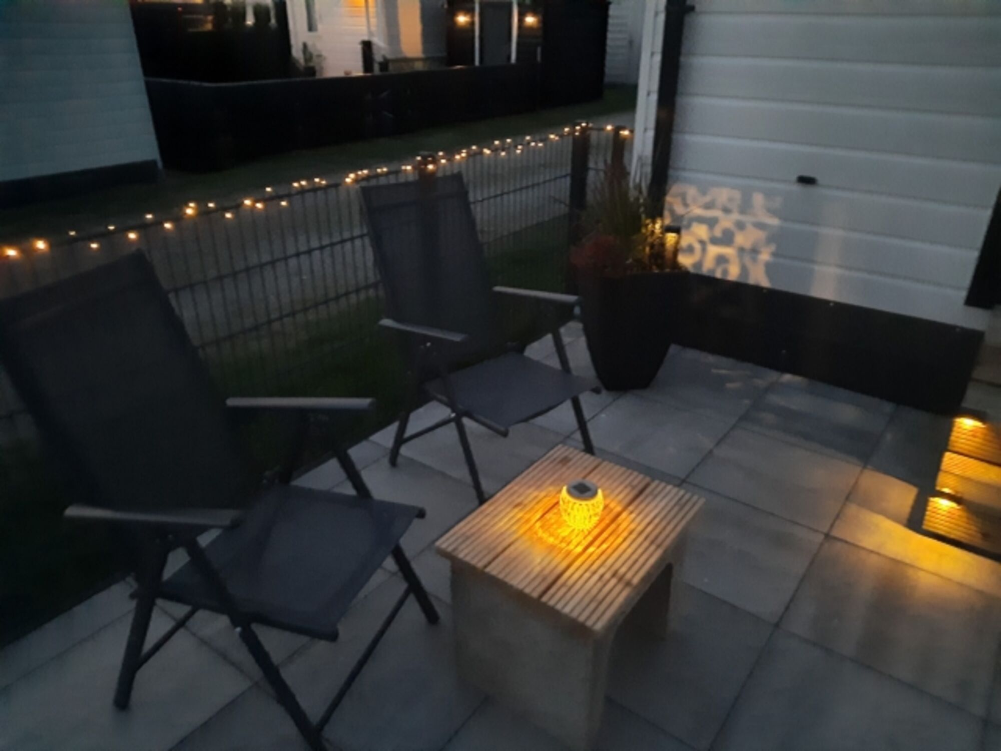 Das Grundstück mit Terasse und Garten ist komplett umzäunt.