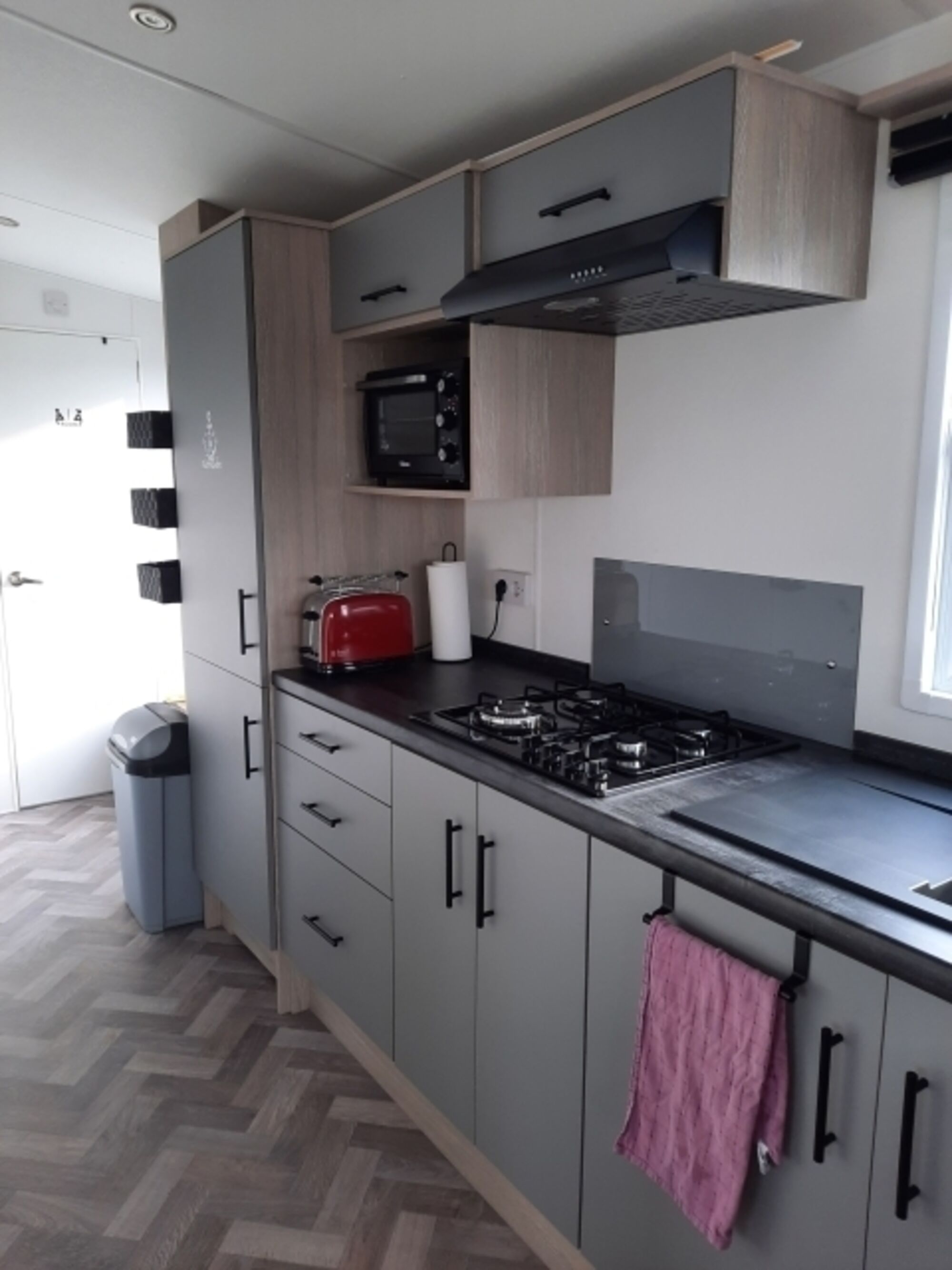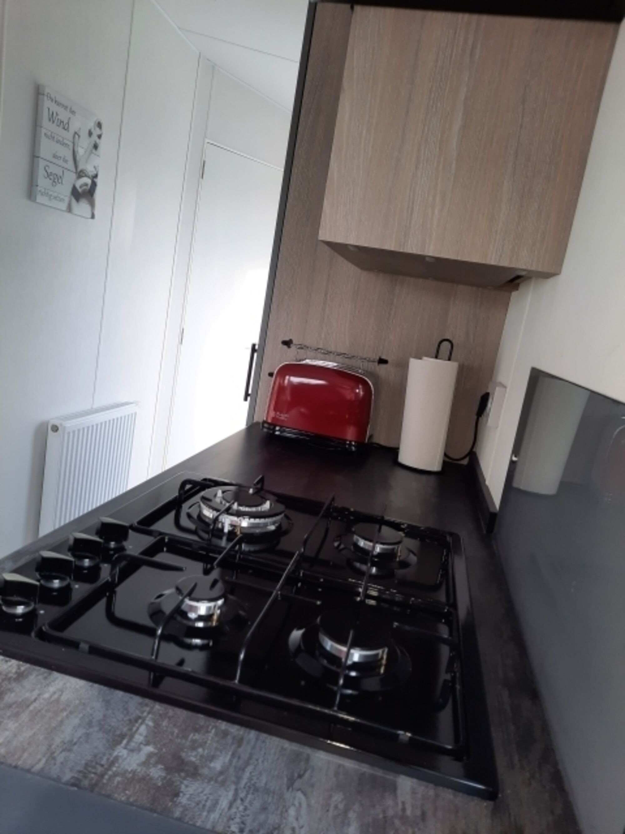 4-Platten Herd, Gasofen / Gasherd, Dunstabzugshaube, Kühlschrank mit Gefrierfach, Gefrierschrank, Mixer, Korkenzieher / Flaschenöffner, Gewürze (Salz, Pfeffer, Zucker), Mülltüten, Essplatz in der Küche
