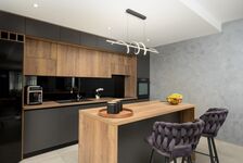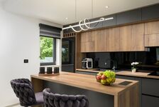 Induktionsherd, Dunstabzugshaube, Kühlschrank mit Gefrierfach, Nespresso-Automat, Geschirrhandtücher, Essplatz in der Küche