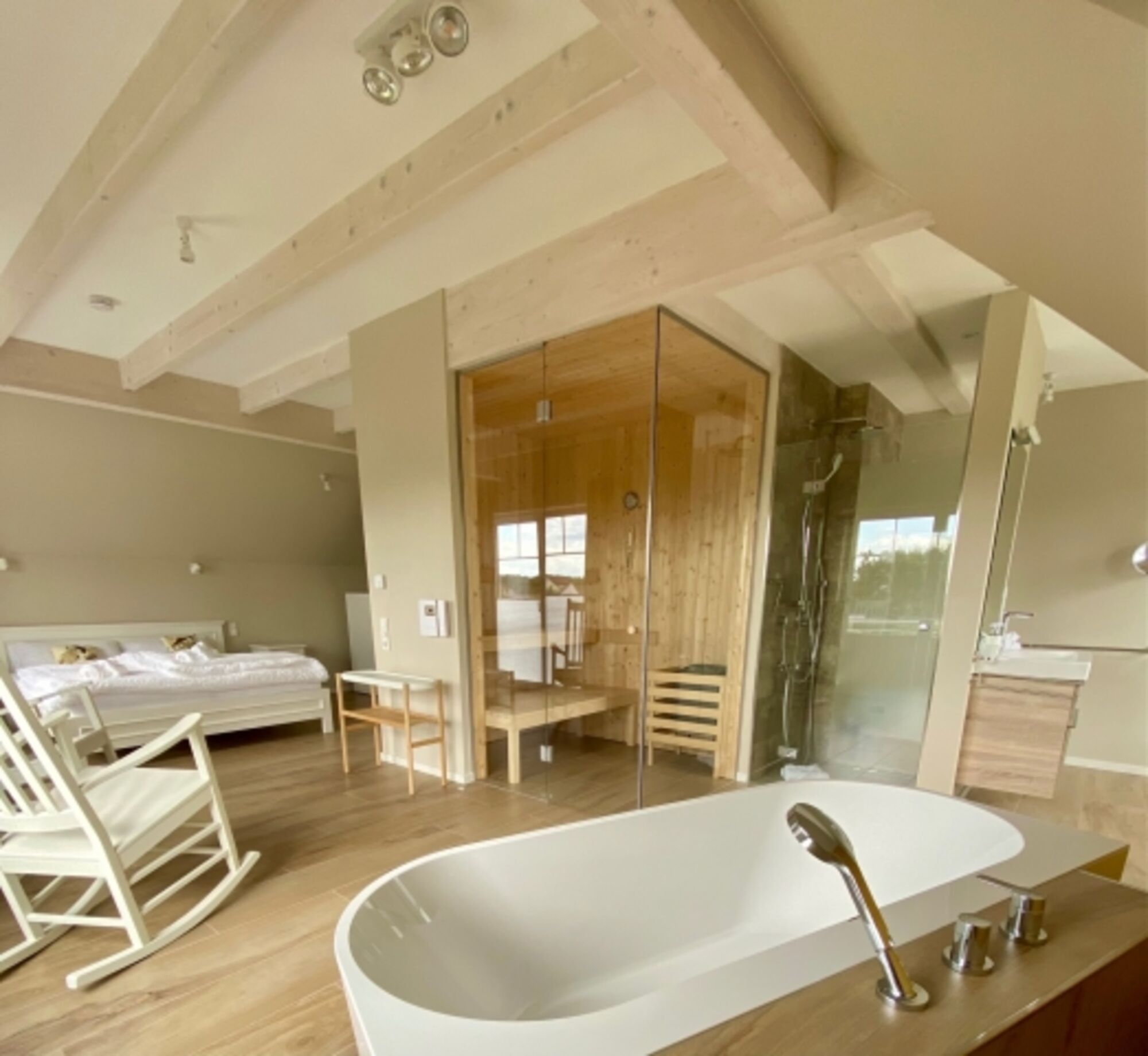 Wellnesschlafzimmer (Badewanne im Schlafzimmer) Doppelbett 1,80 x 2,00m, Leselampe am Bett, Fliegengitter