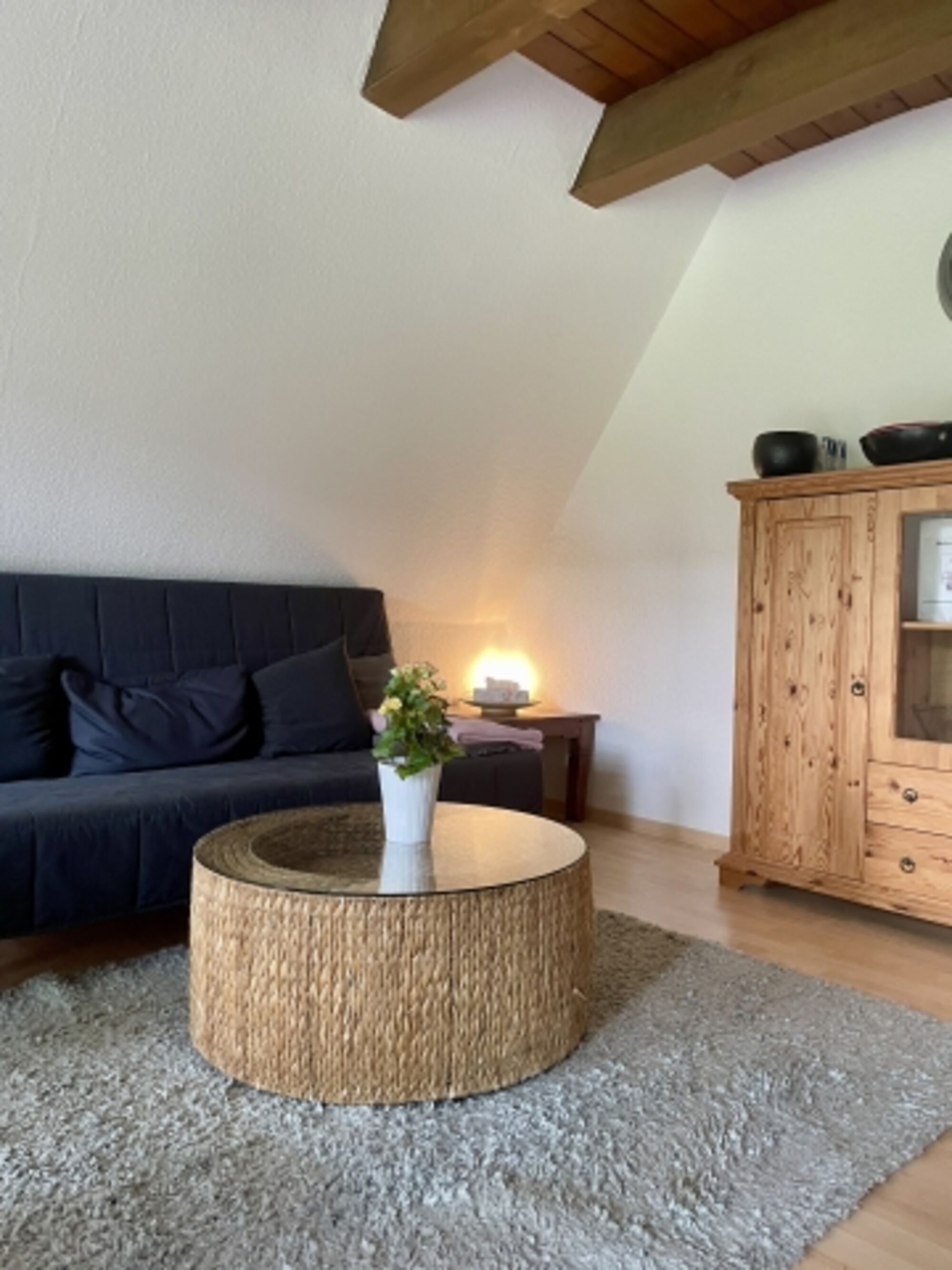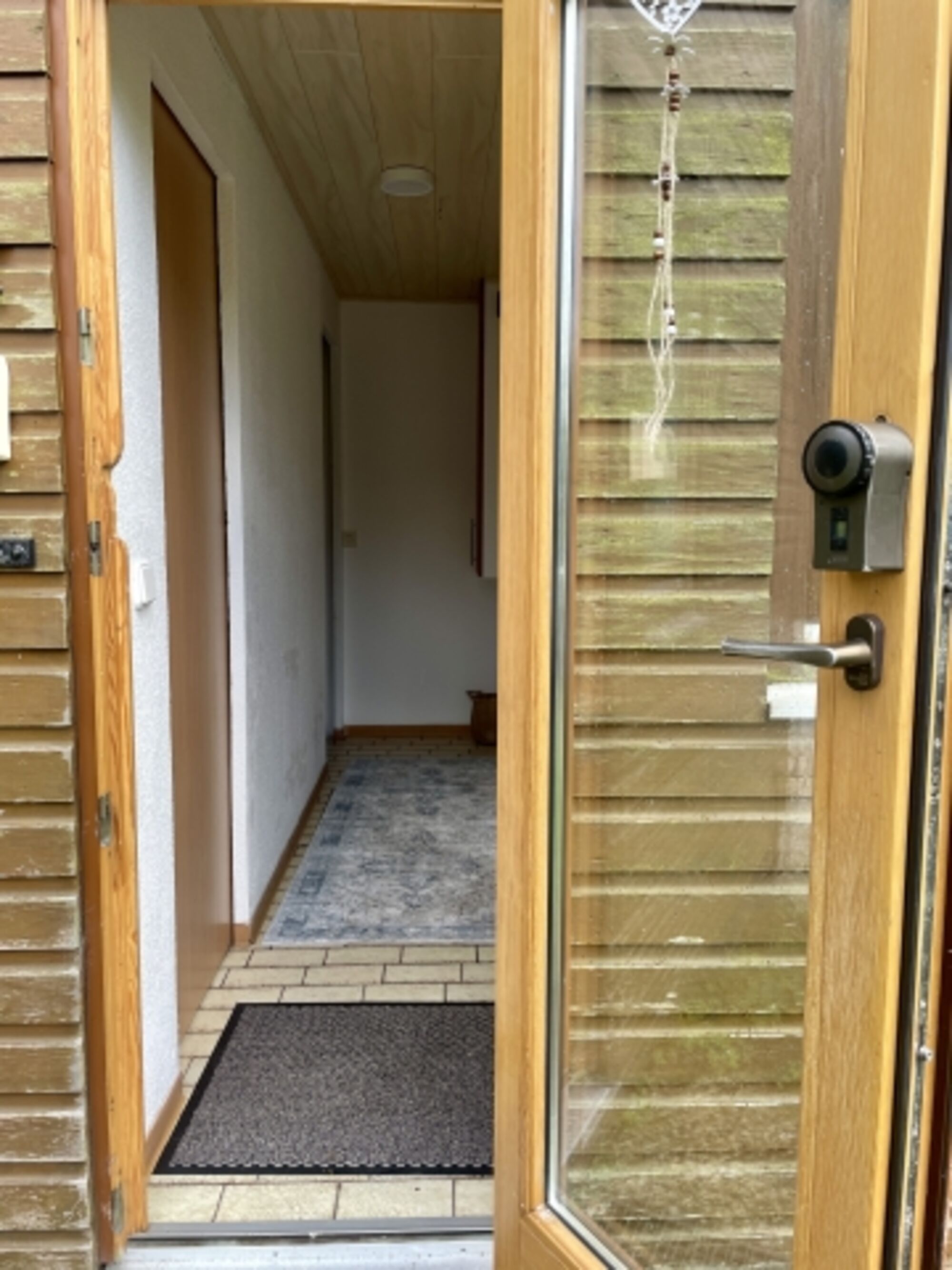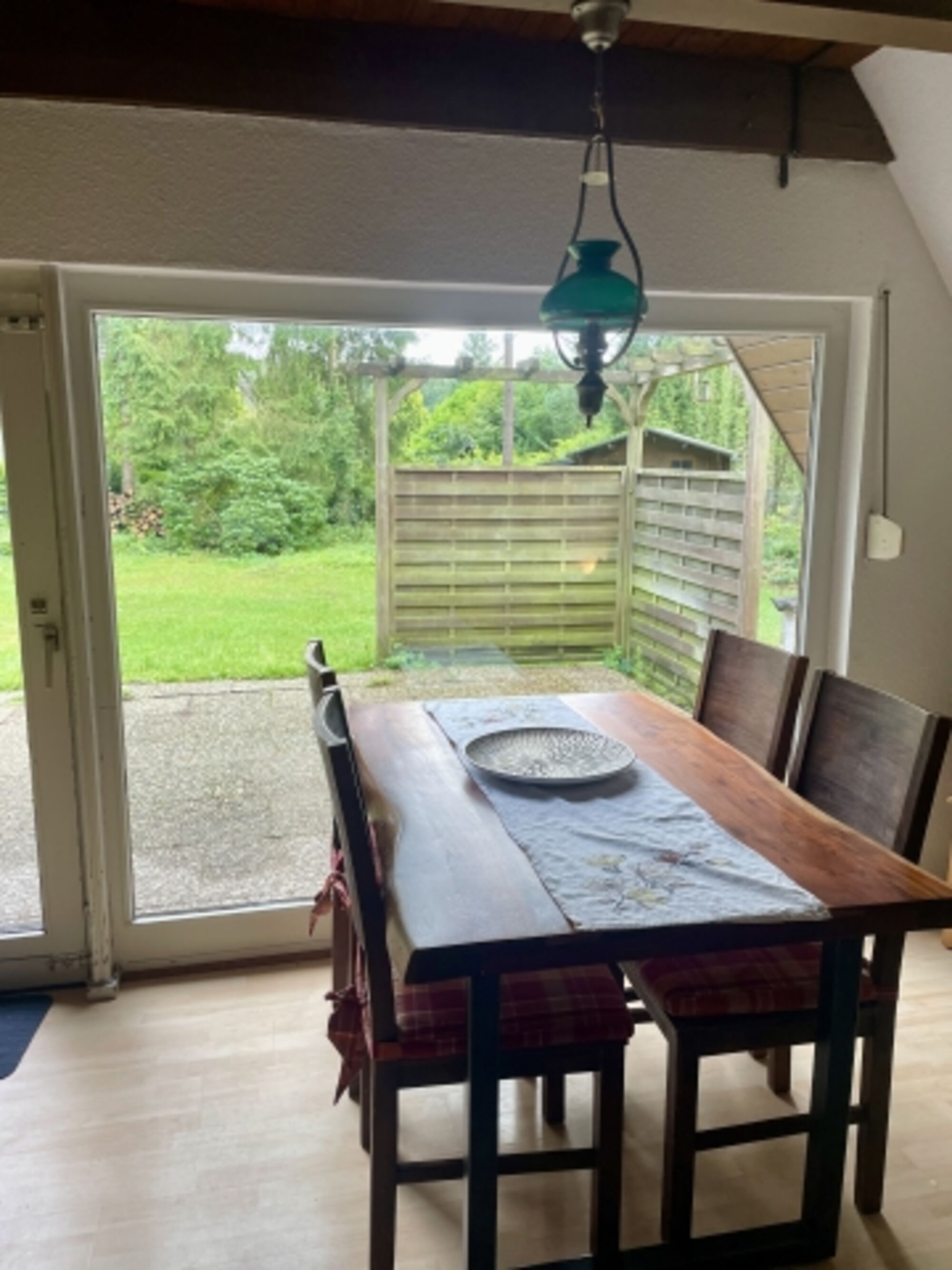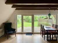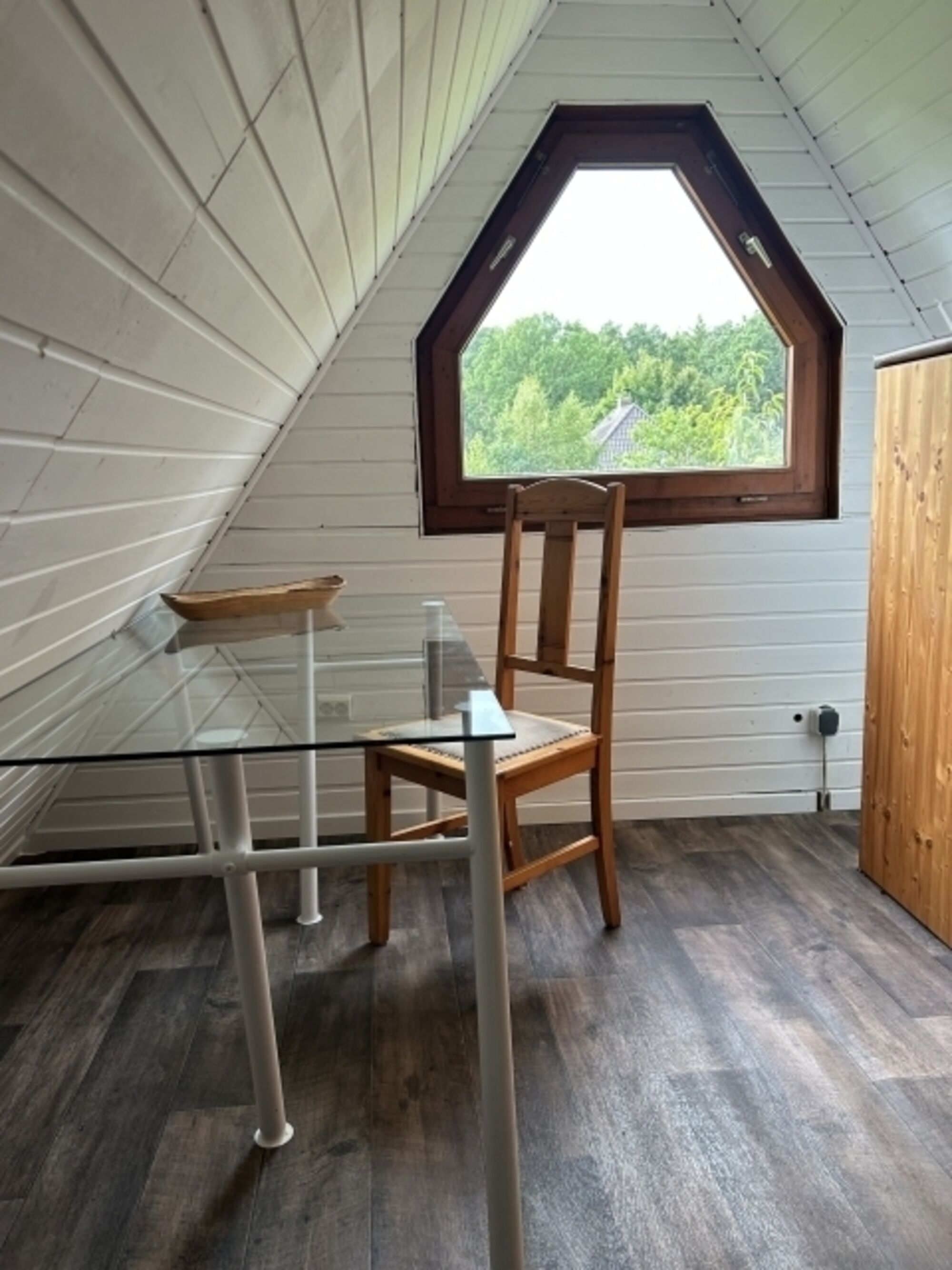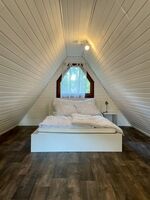 Vom Flur aus kommt ihr in das kleine Badezimmer mit Duschwanne, in die Küche und von hier aus weiter in das Wohnzimmer. Das große Wohnzimmer besticht durch seine große Fensterfront mit einer schönen Aussicht auf die Terrasse und den großen umzäunten Garten. Hier findet Ihr außerdem den Essbereich und ein Schlafsofa. Wieder zurück in den Flur geht es außerdem zum Durchgangszimmer mit Garderobe und viel Stauraum. Von hier aus geht es über eine ulkige Treppe hinauf in das Obergeschoss. Hier befindet sich das gemütliche Schlafzimmer mit Einbauschränken und Schreibtisch.