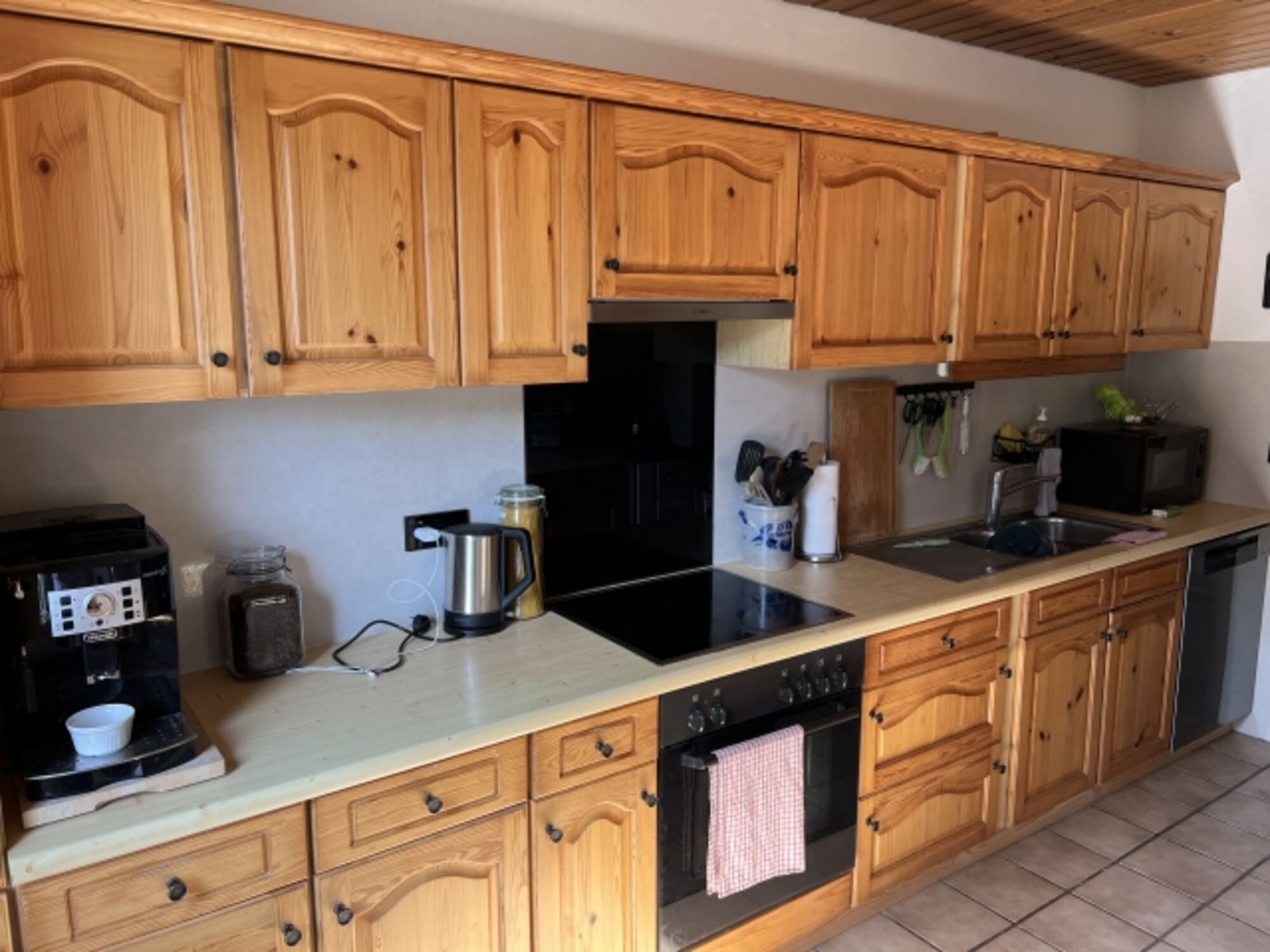 4-Platten Herd, Cerankochfeld, Dunstabzugshaube, Kaffeevollautomat, Eierkocher, Waffeleisen, Korkenzieher / Flaschenöffner, Gewürze (Salz, Pfeffer, Zucker), Öl / Essig, Geschirrhandtücher, Mülltüten