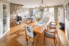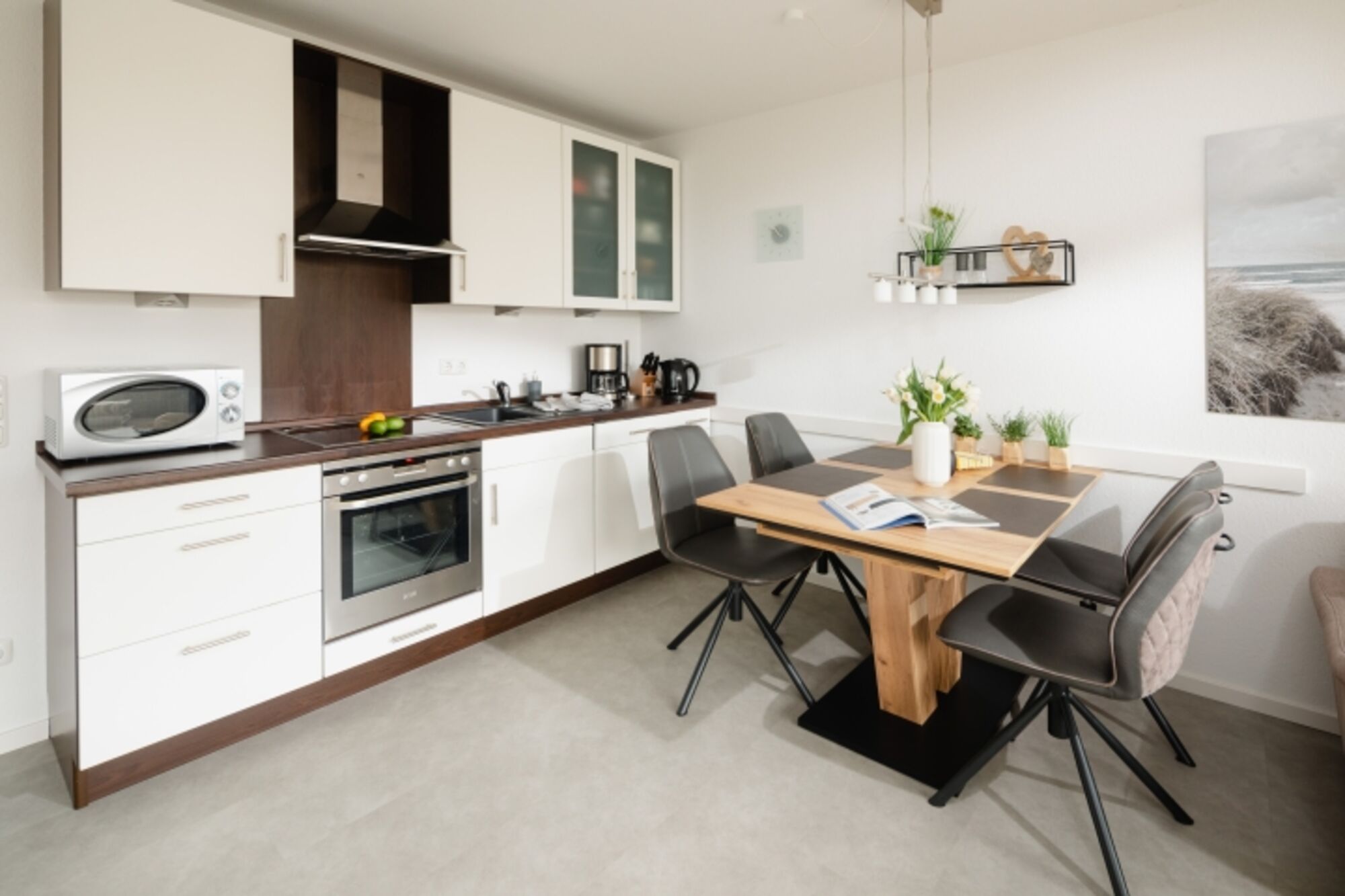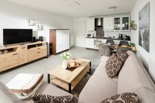 Der großzügige helle Wohnbereich ist ausgestattet mit einem gemütlichen Sofa, einem Flachbildschirm, einer modernen Einbauküche mit dazugehörigem Essbereich. Die Küche ist selbsverständlich ausgestattet mit einem Geschirrspüler, einer Mikrowelle, einem Ceranfeld und einem Backofen.