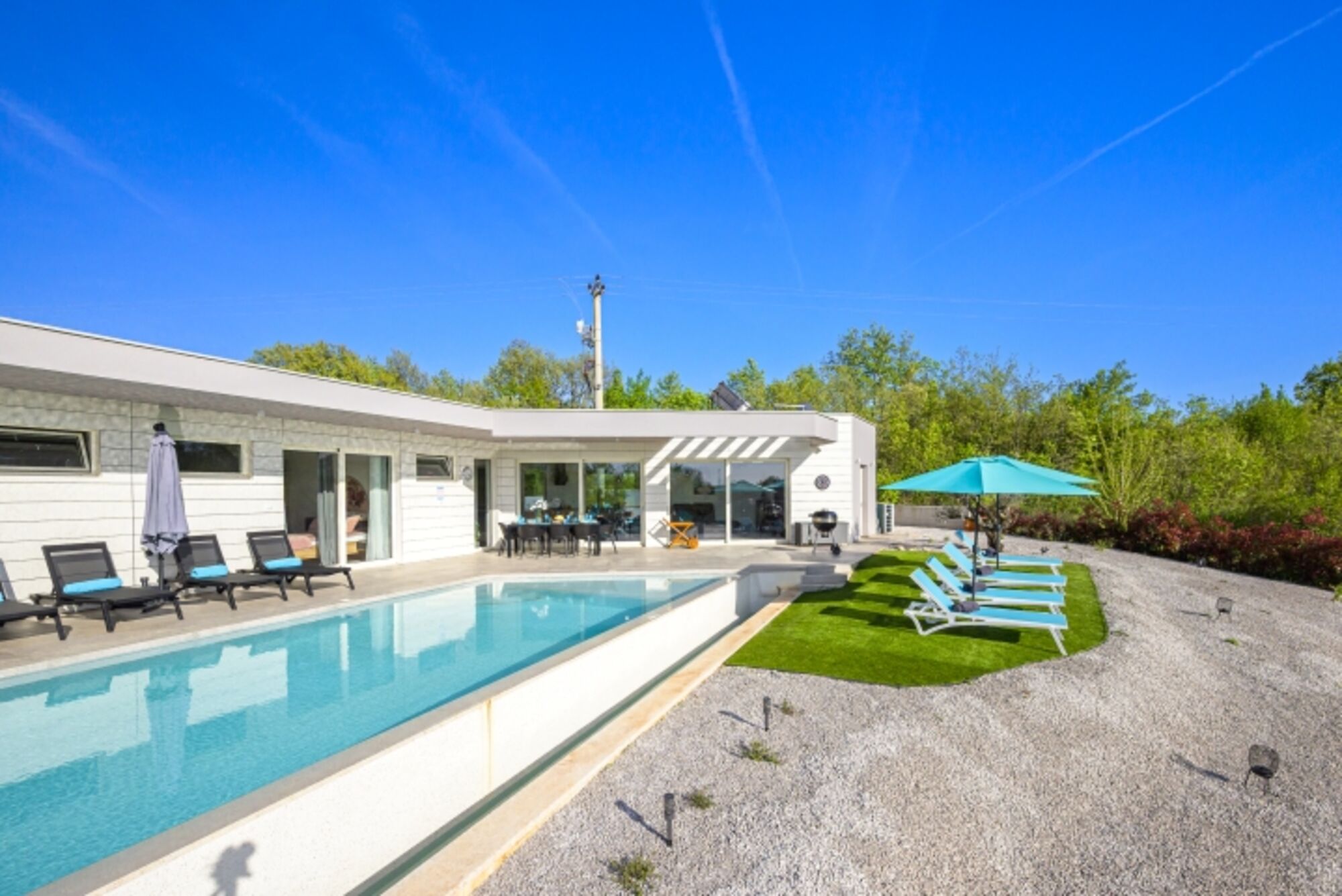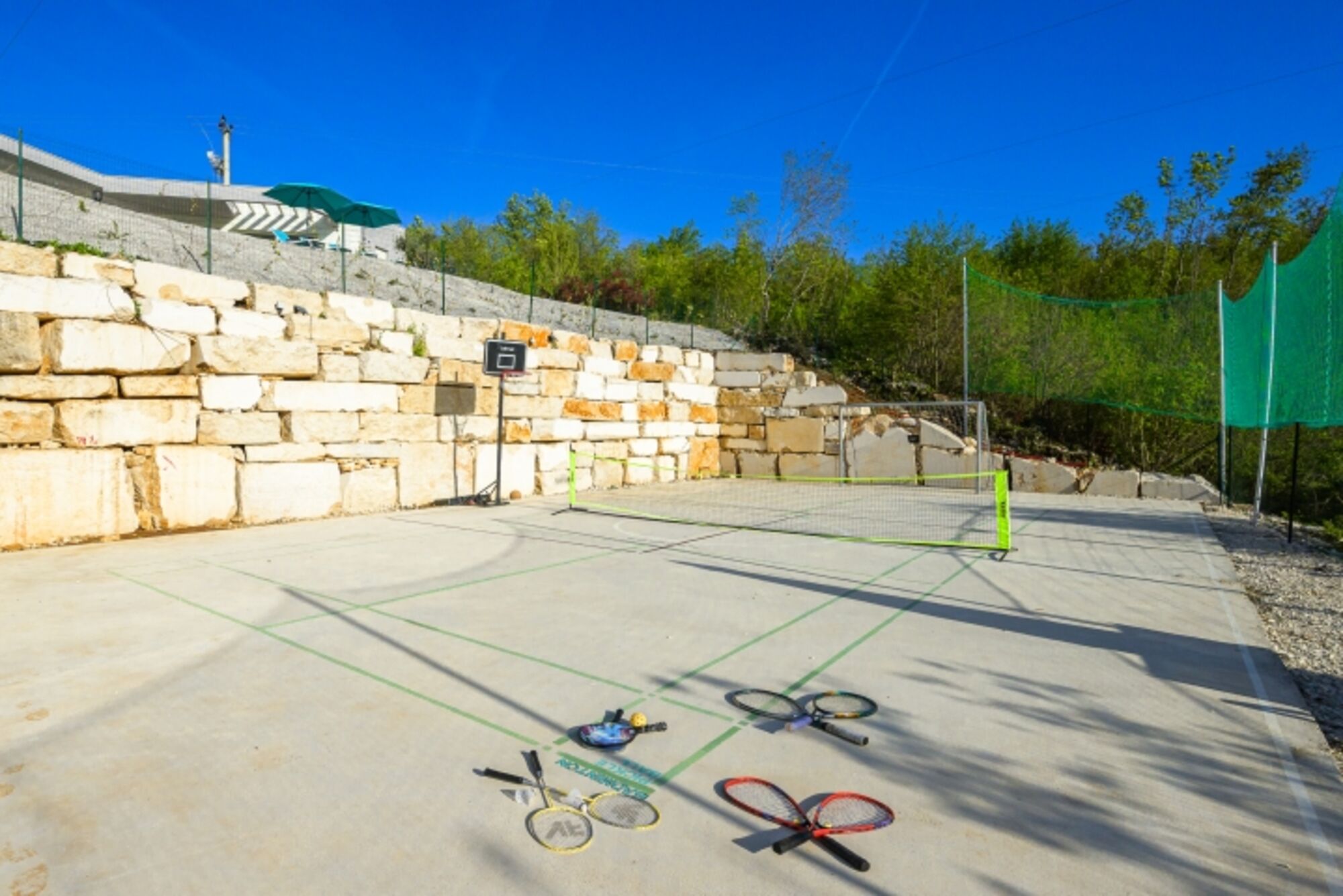 Die Villa verfügt über drei geräumige Schlafzimmer und drei modern ausgestattete Badezimmer. Für zusätzlichen Komfort sorgt ein beheizter Pool, der auch außerhalb der Sommermonate genutzt werden kann. Auf dem Grundstück befindet sich ein privater Sportplatz, auf dem Tennis, Kleinfeldfußball oder Volleyball gespielt werden kann – ideal für aktive Gäste.