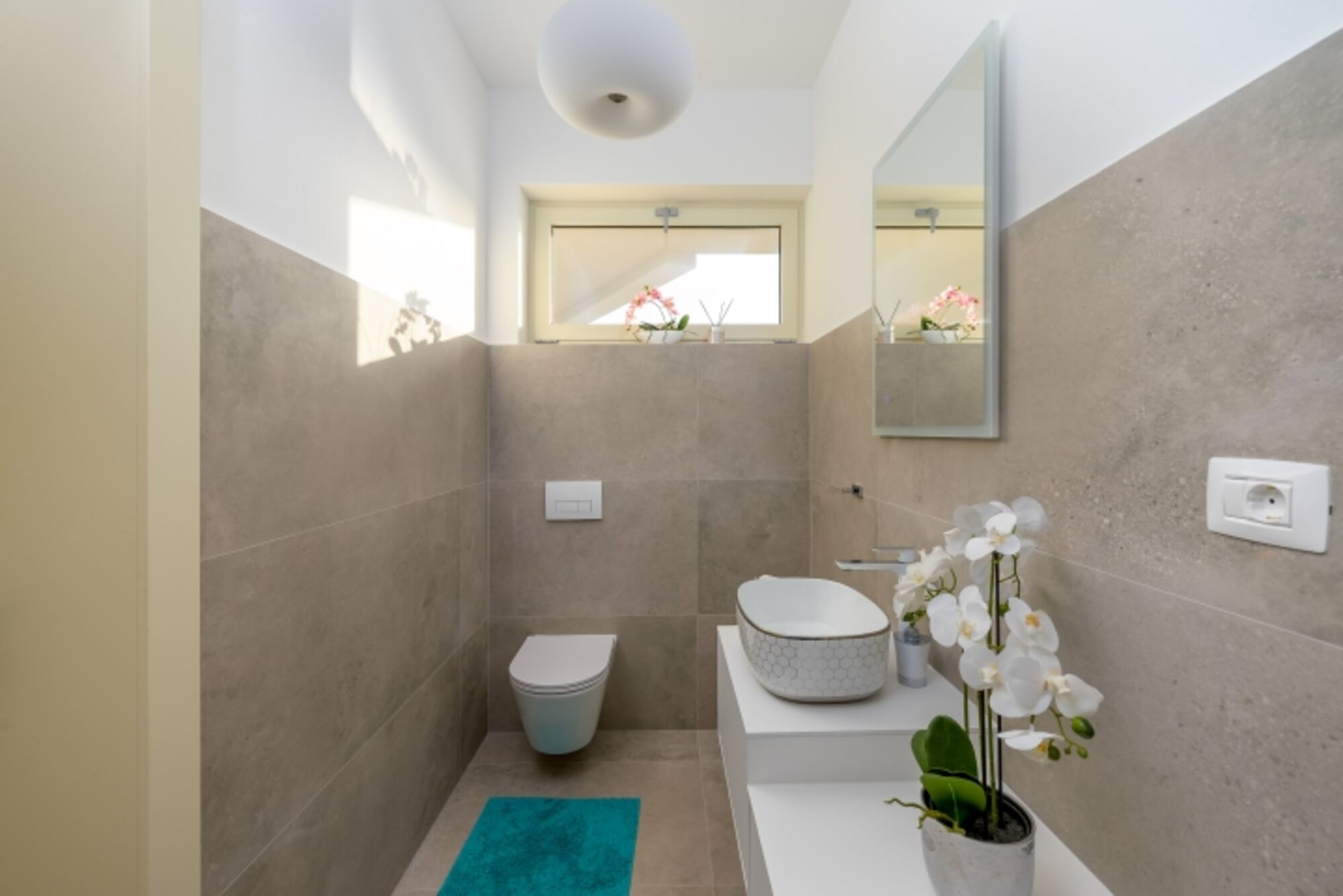 Waschbecken, Spiegel, Fenster im Bad
