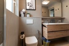 • Obergeschoss: Tageslichtbad mit Doppelwaschbecken, ebenerdiger Dusche (80 cm), WC mit Hygienedusche, beleuchteter Spiegel, Pflegeartikel, Hand- & Duschtücher